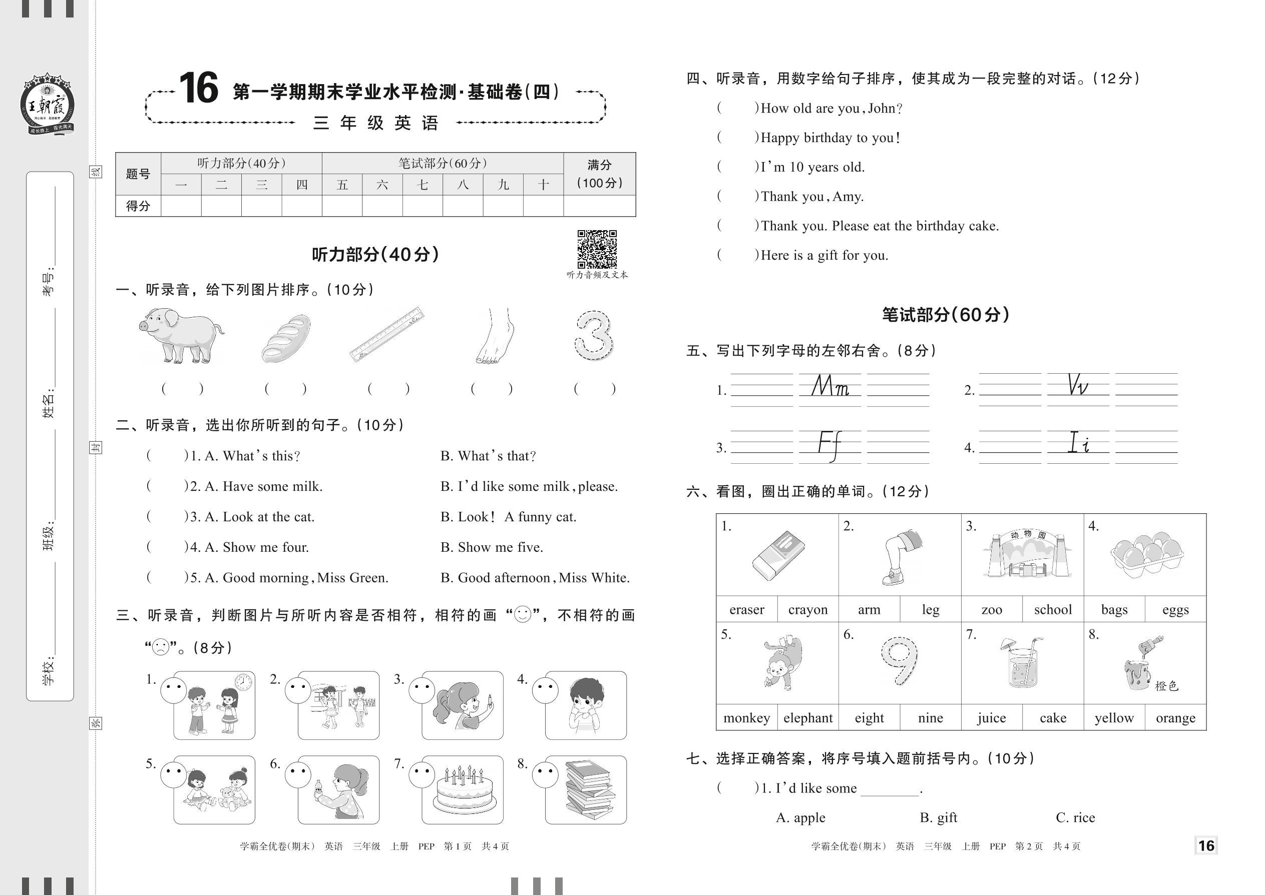 2022上册三年级英语人教PEP版 16 第一学期期末学业水平检测·基础卷(四)