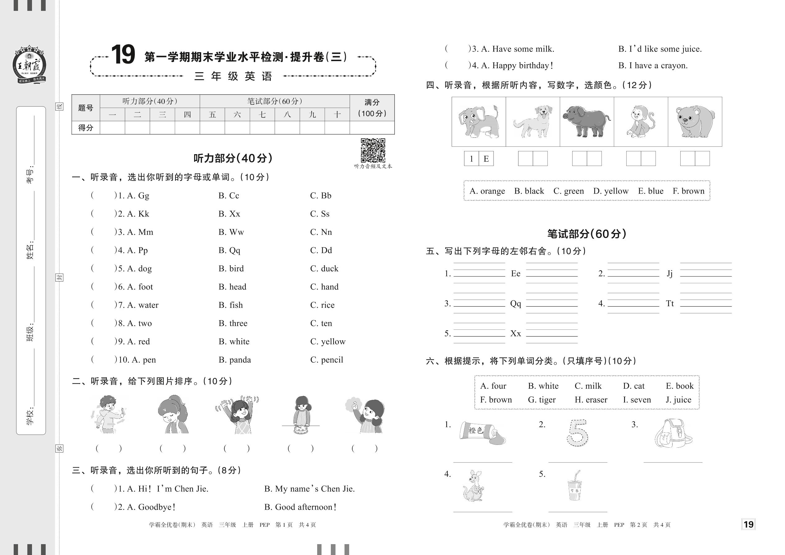 2022上册三年级英语人教PEP版 19 第一学期期末学业水平检测·提升卷(三)