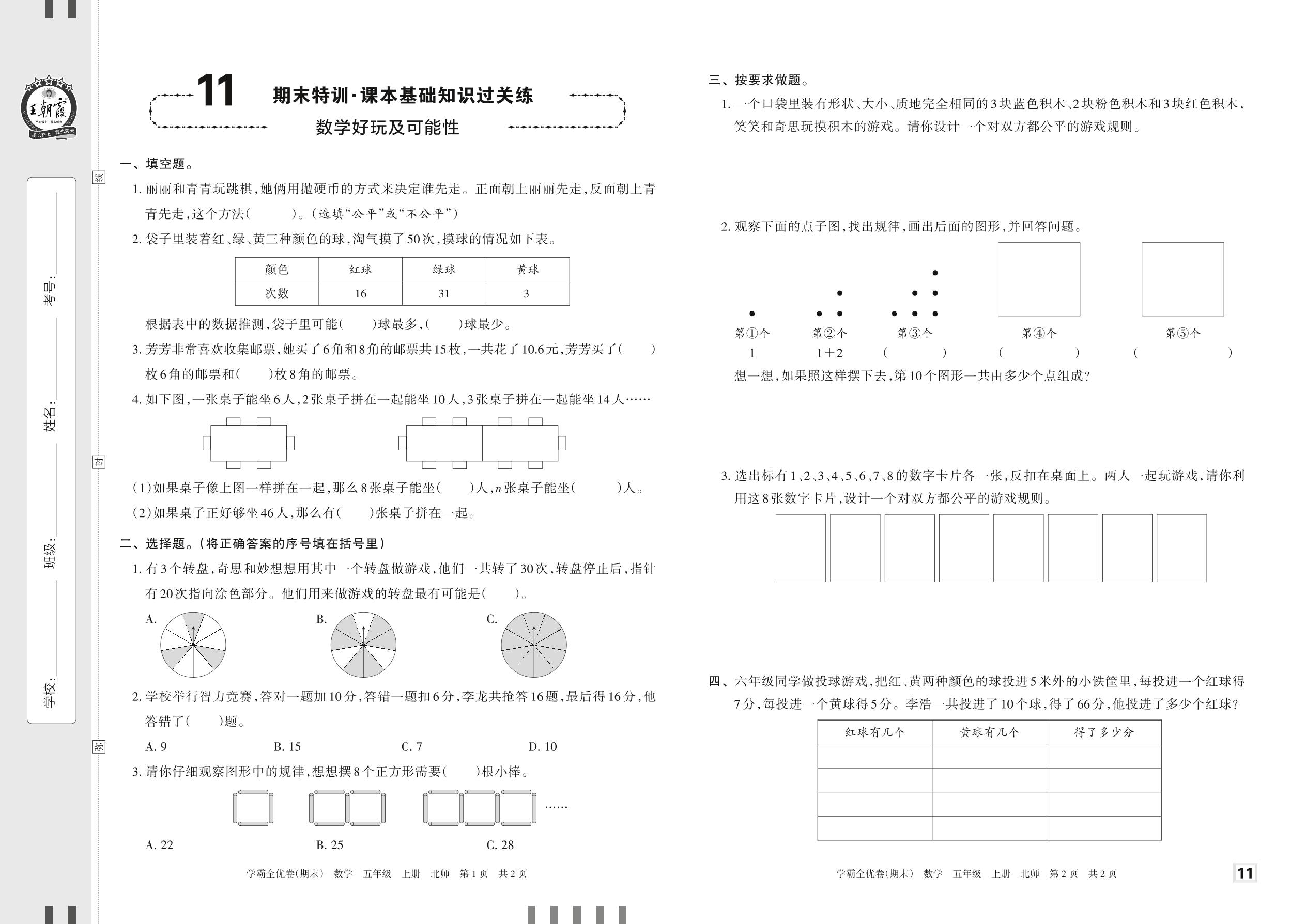 2022上册五年级数学北师版 11 期末特训·课本基础知识过关练——数学好玩及可能性