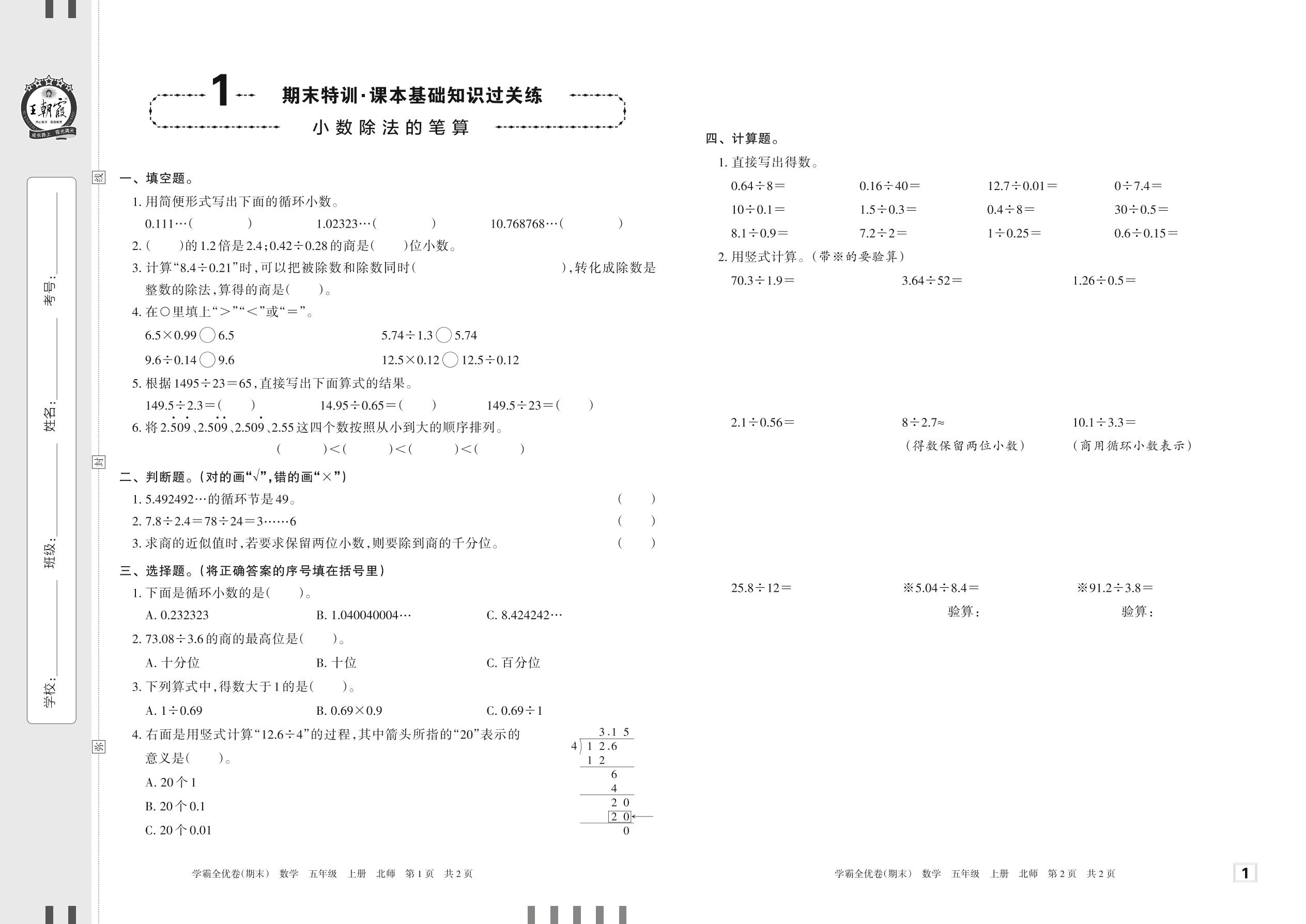2022上册五年级数学北师版 1 期末特训·课本基础知识过关练——小数除法的笔算