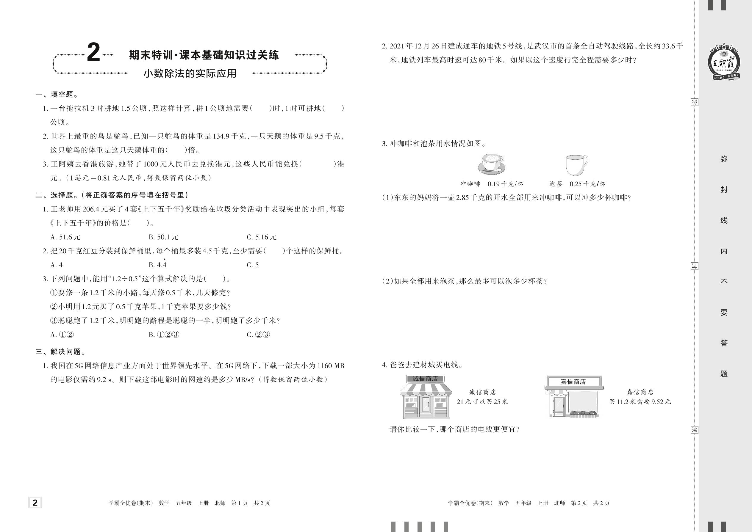 2022上册五年级数学北师版 2 期末特训·课本基础知识过关练——小数除法的实际应用