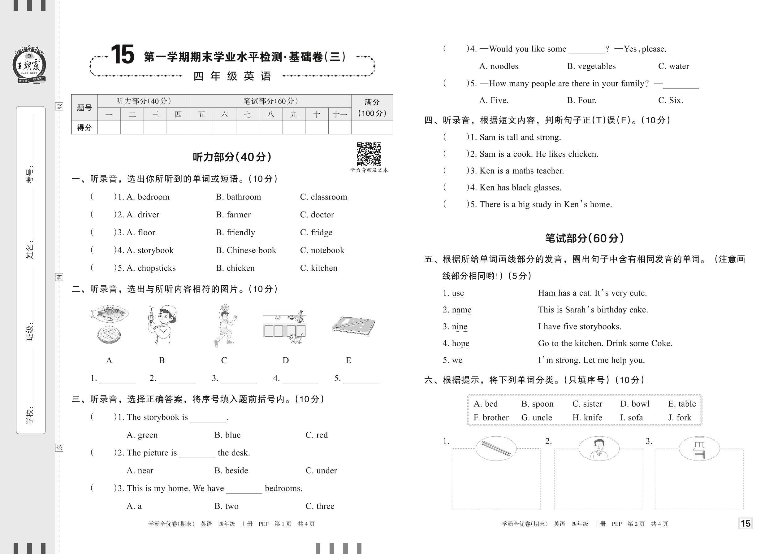 四年级英语人教PEP版(三起始)上册期末卷