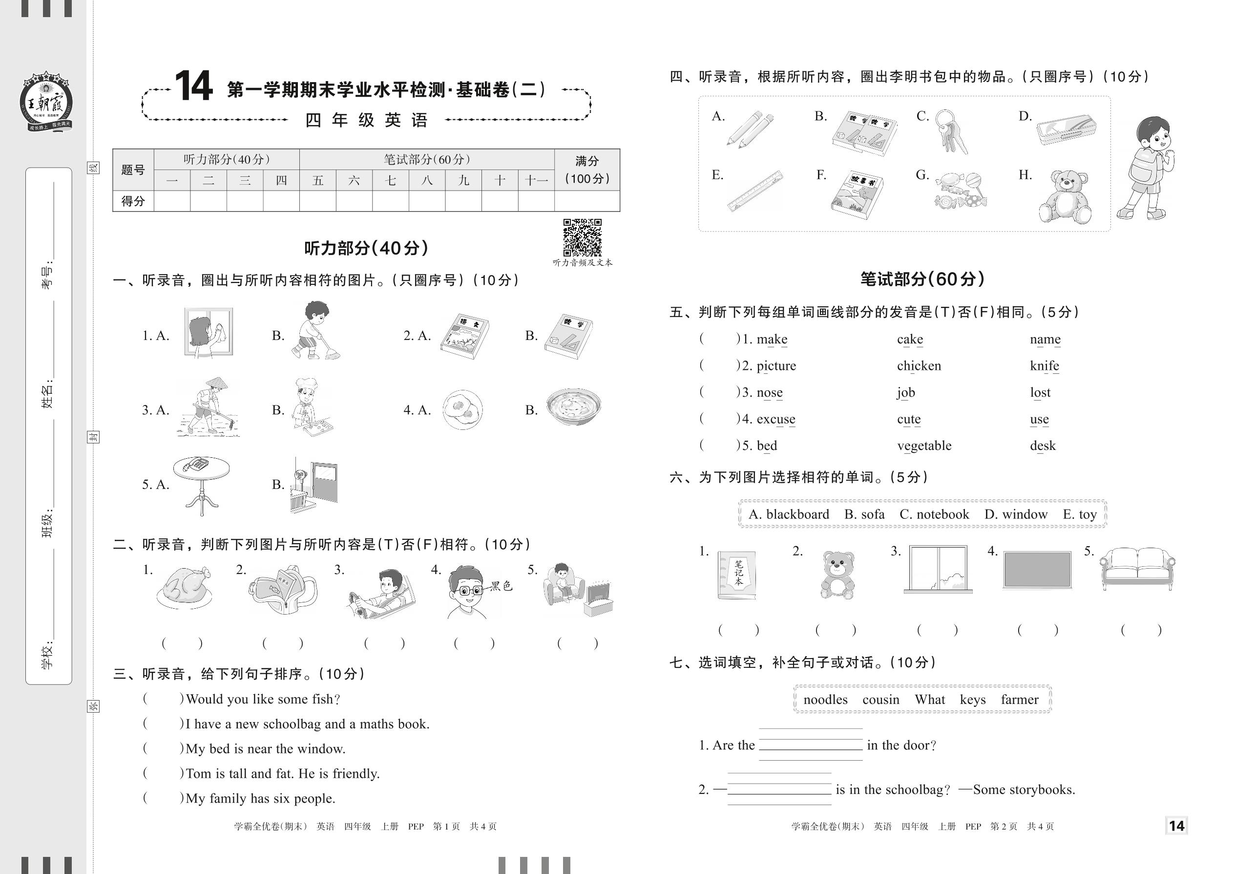 2022上册四年级英语人教PEP版 14 第一学期期末学业水平检测·基础卷(二)