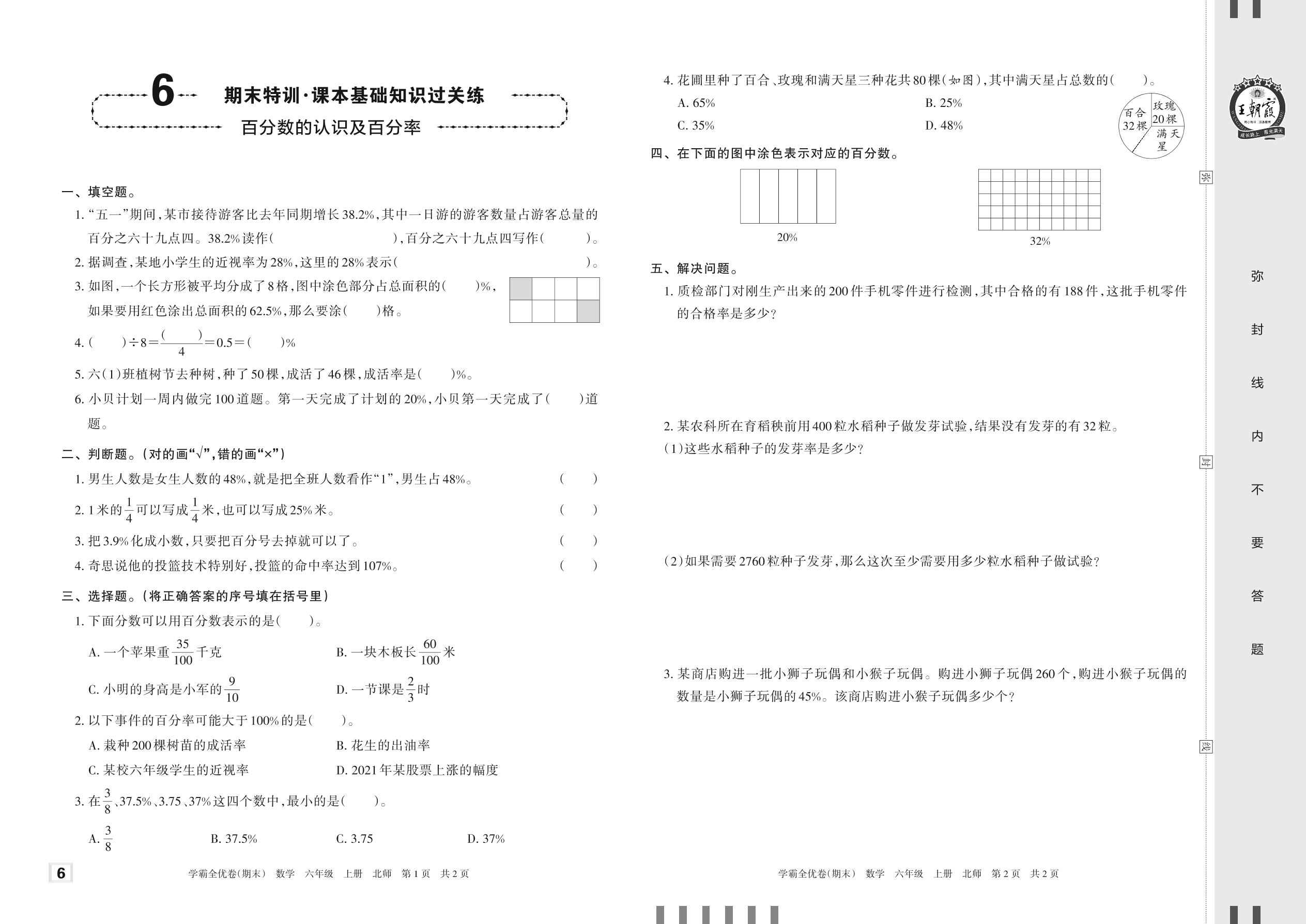 2022上册六年级数学北师版 6 期末特训·课本基础知识过关练——百分数的认识及百分率
