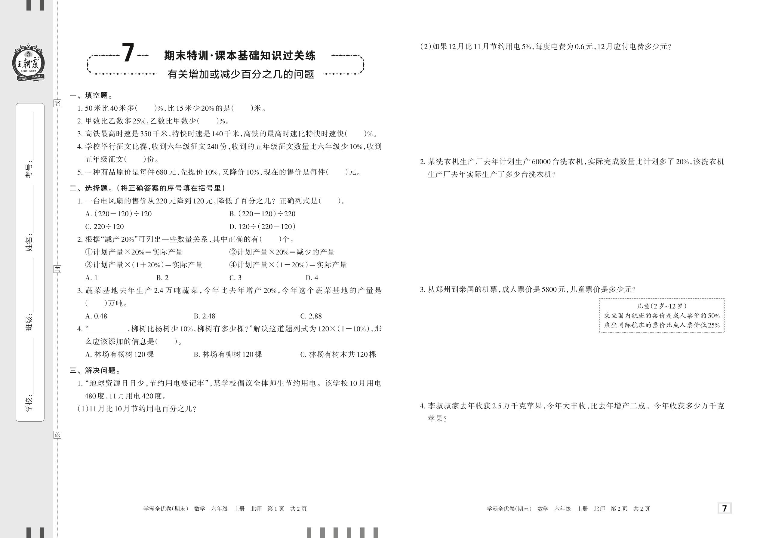 2022上册六年级数学北师版 7 期末特训·课本基础知识过关练——有关增加或减少百分之几的问题