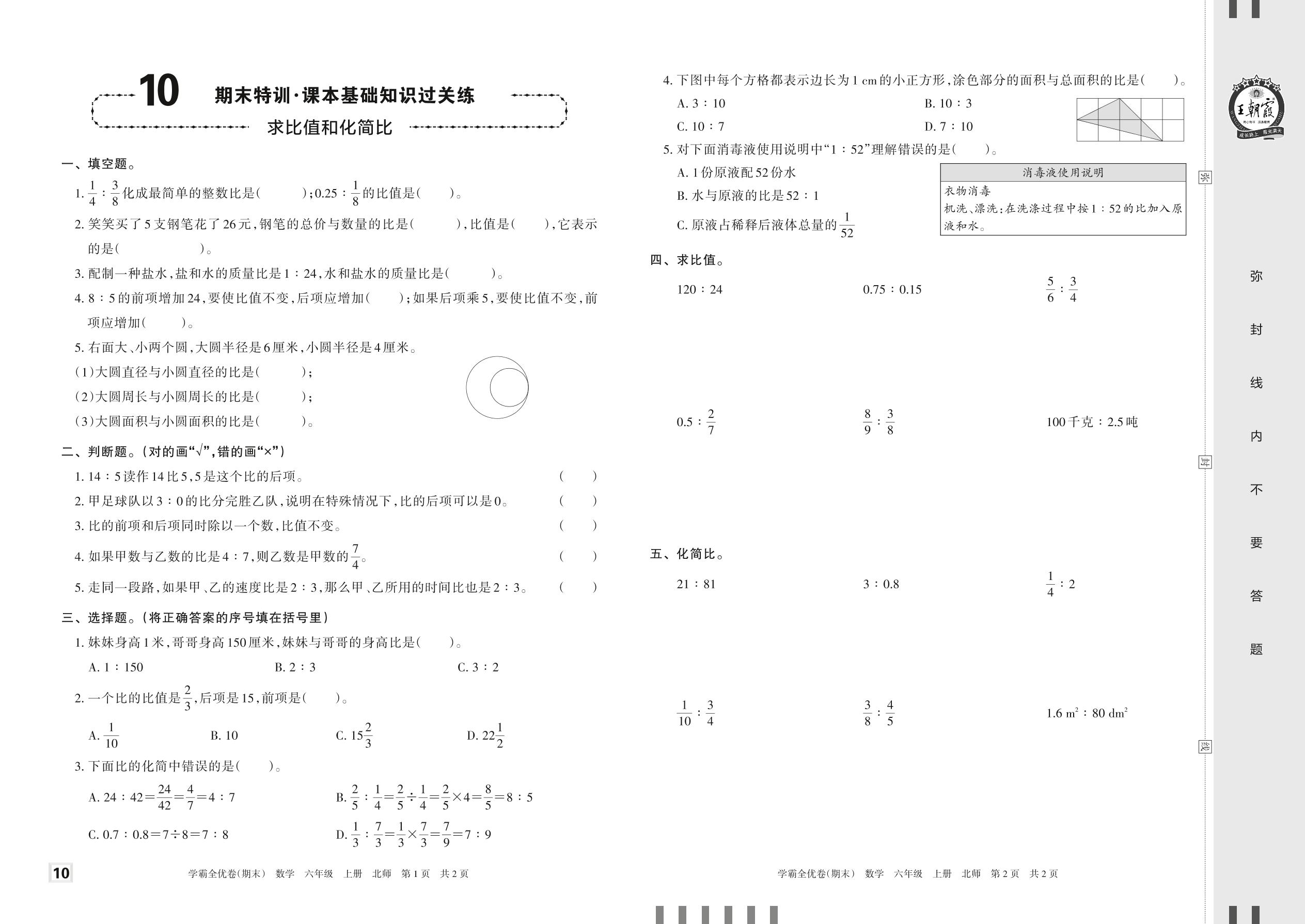 2022上册六年级数学北师版 10 期末特训·课本基础知识过关练——求比值和化简比
