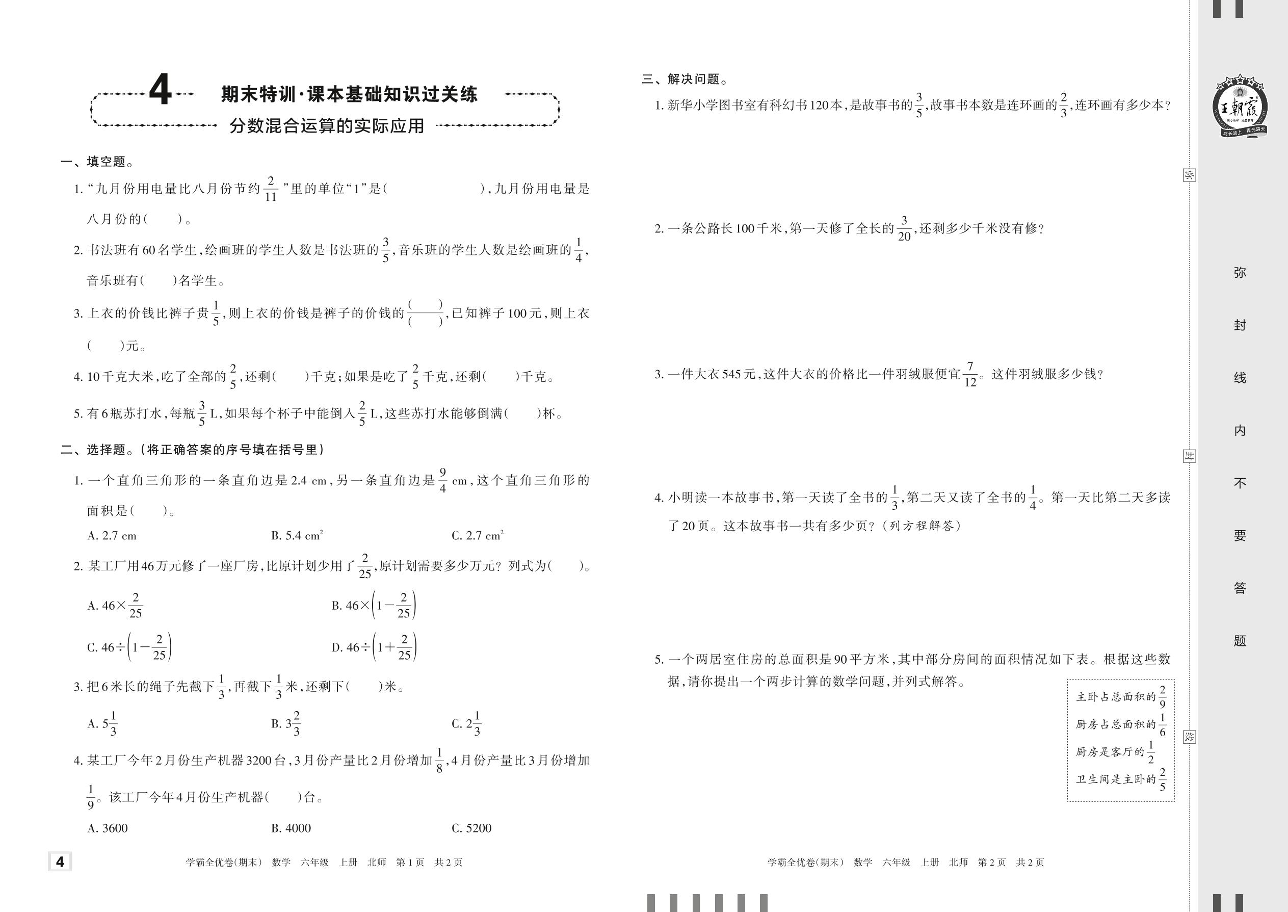 2022上册六年级数学北师版 4 期末特训·课本基础知识过关练——分数混合运算的实际应用