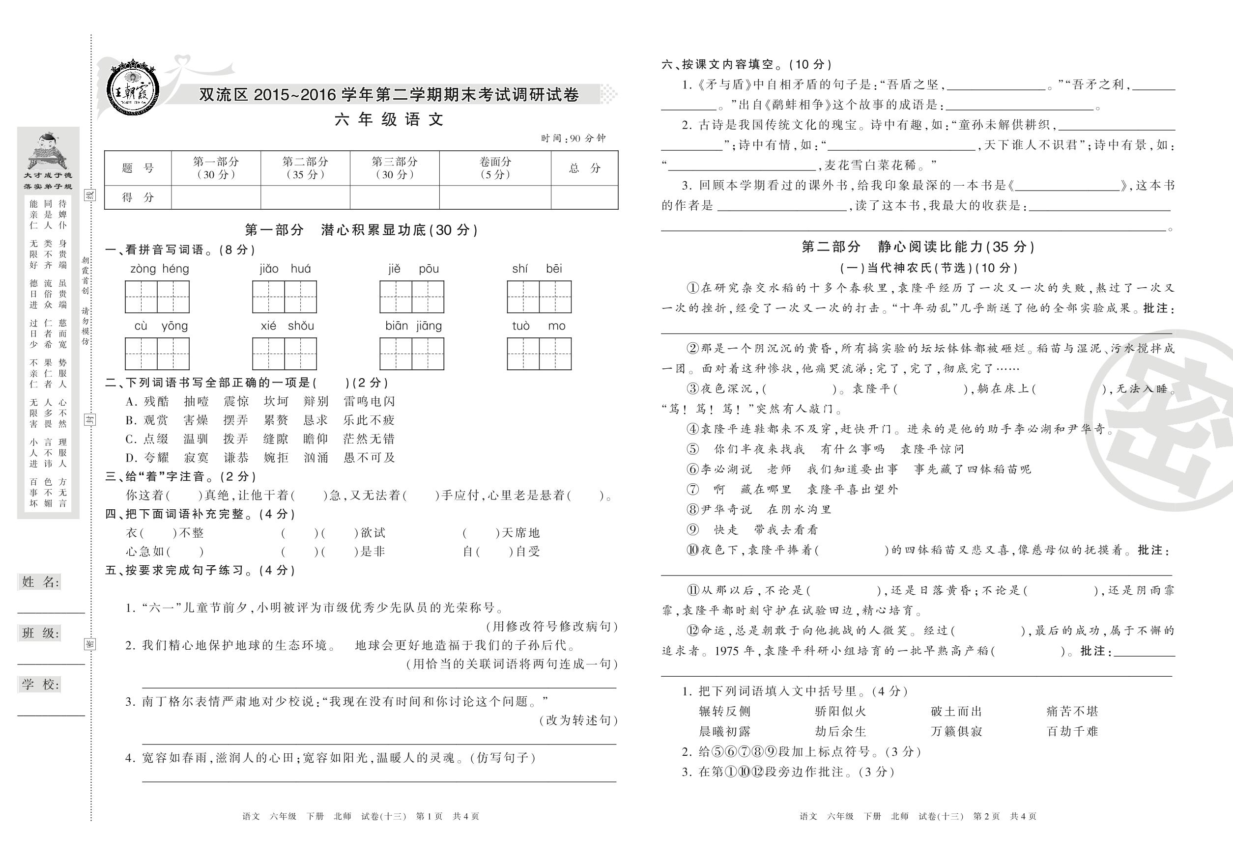 2015-2016学年第二学期成都市双流区六年级语文试卷(北师版)【13】
