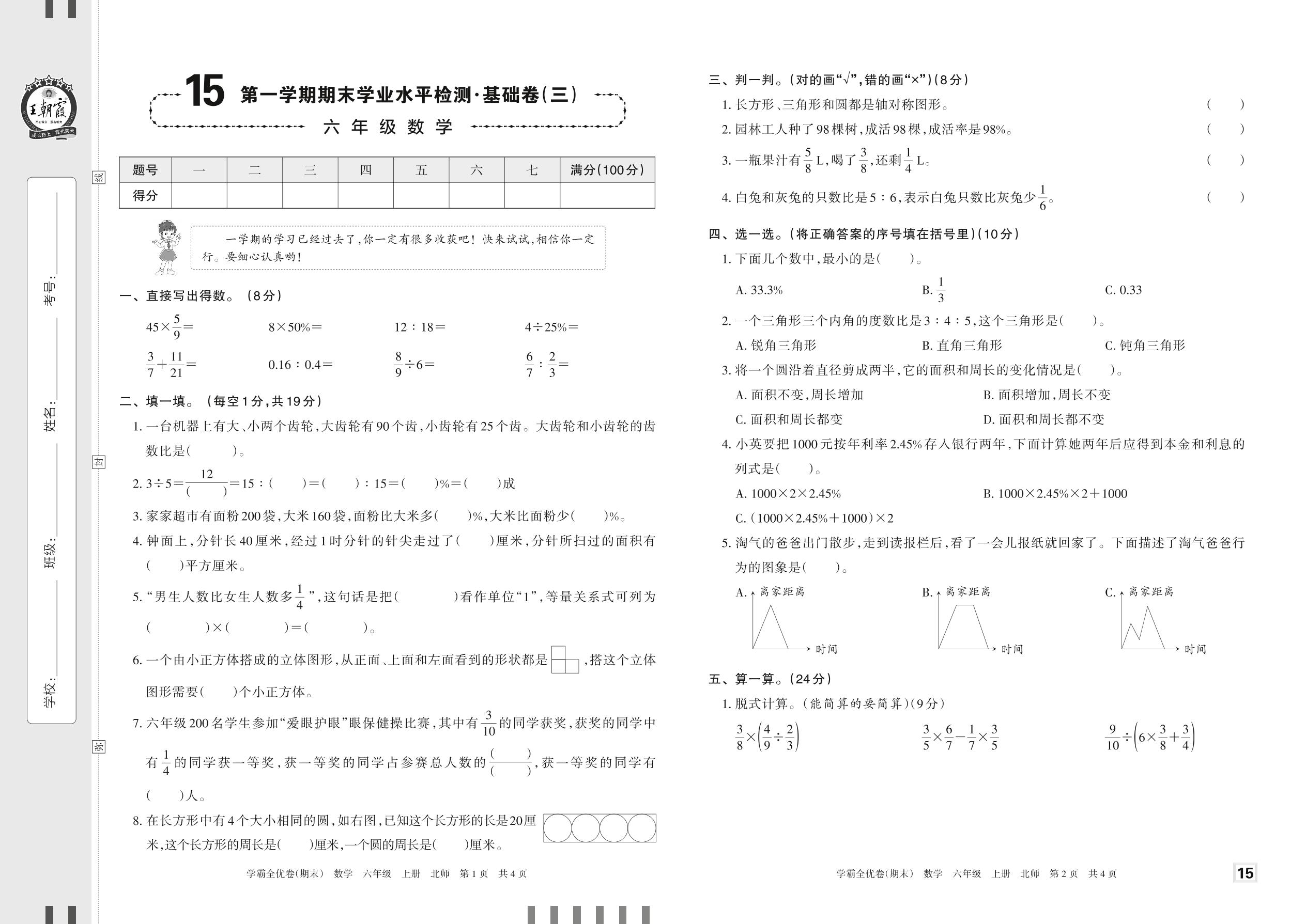 2022上册六年级数学北师版 15 第一学期期末学业水平检测·基础卷(三)