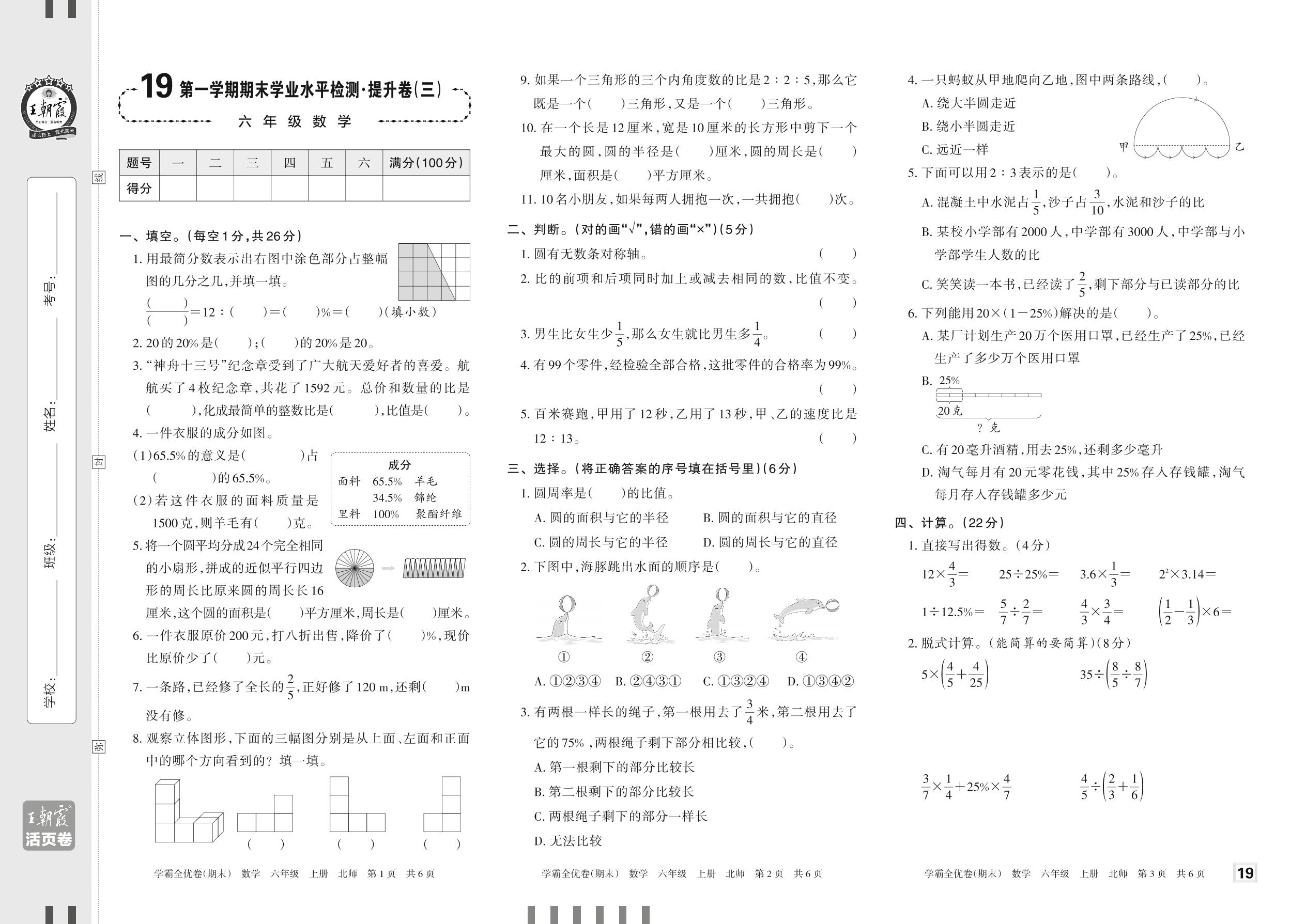 2022上册六年级数学北师版 19 第一学期期末学业水平检测·提升卷(三)