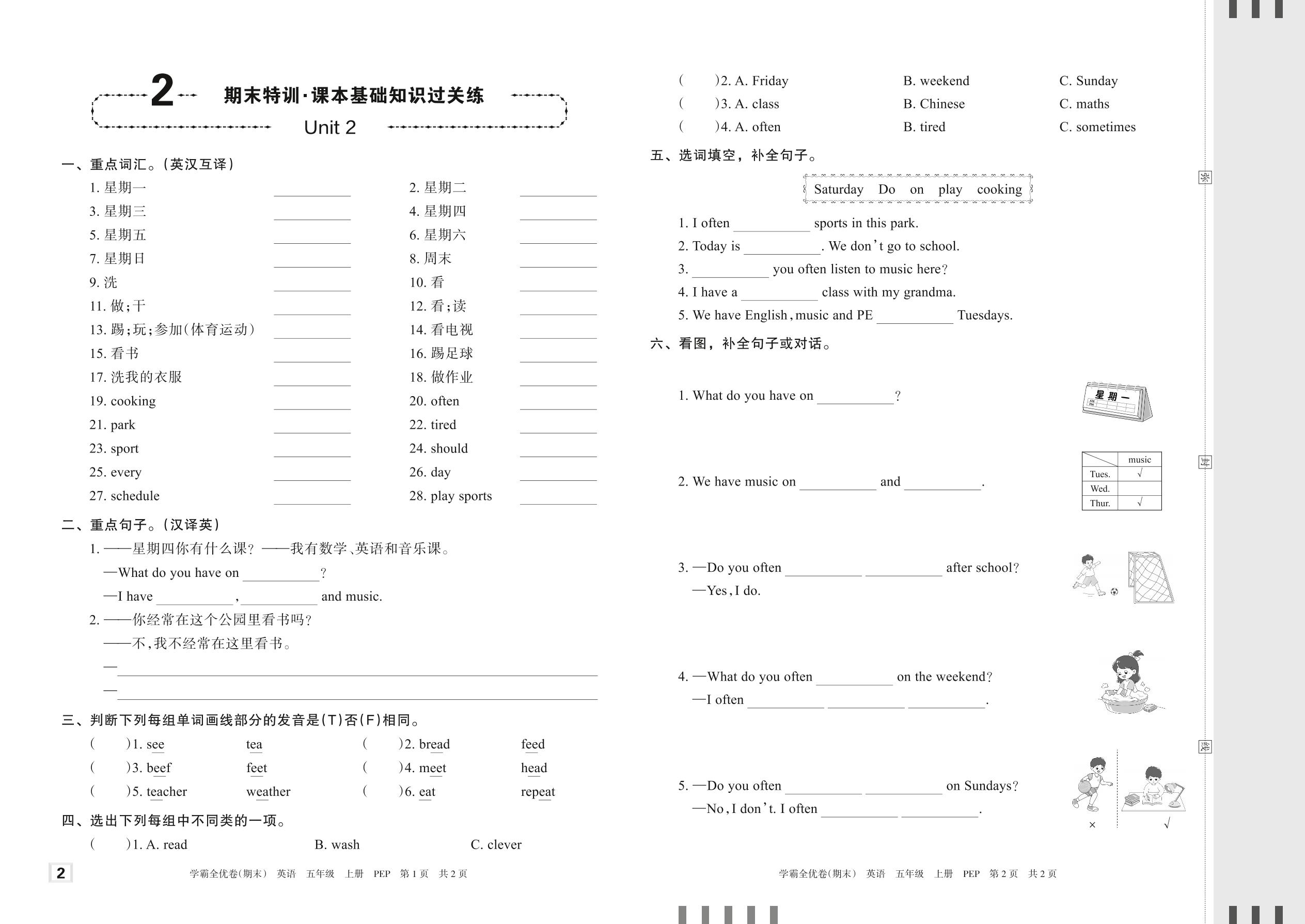 2022上册五年级英语人教PEP版 2 期末特训·课本基础知识过关练——Unit 2