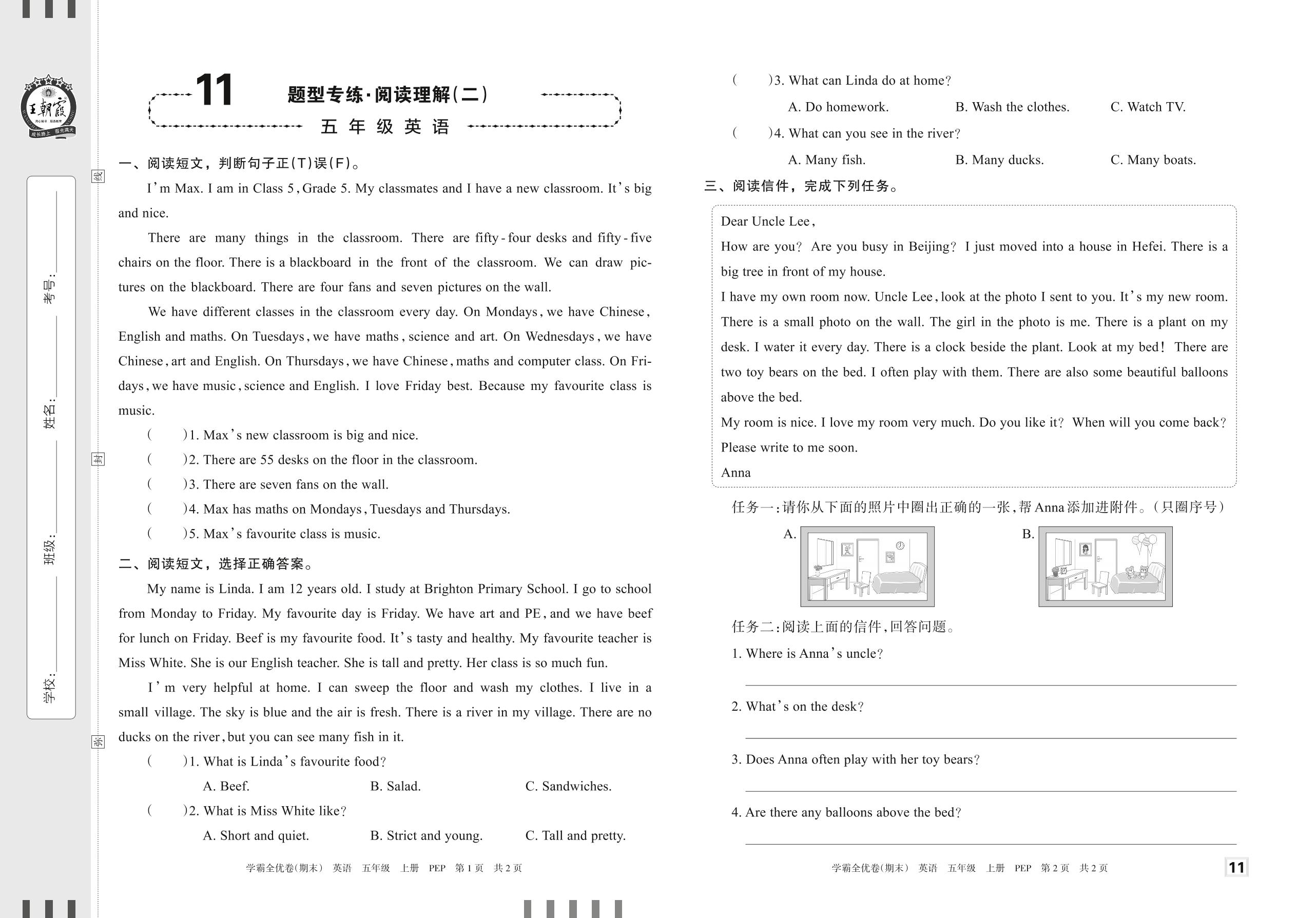 2022上册五年级英语人教PEP版 11 题型专练·阅读理解(二)