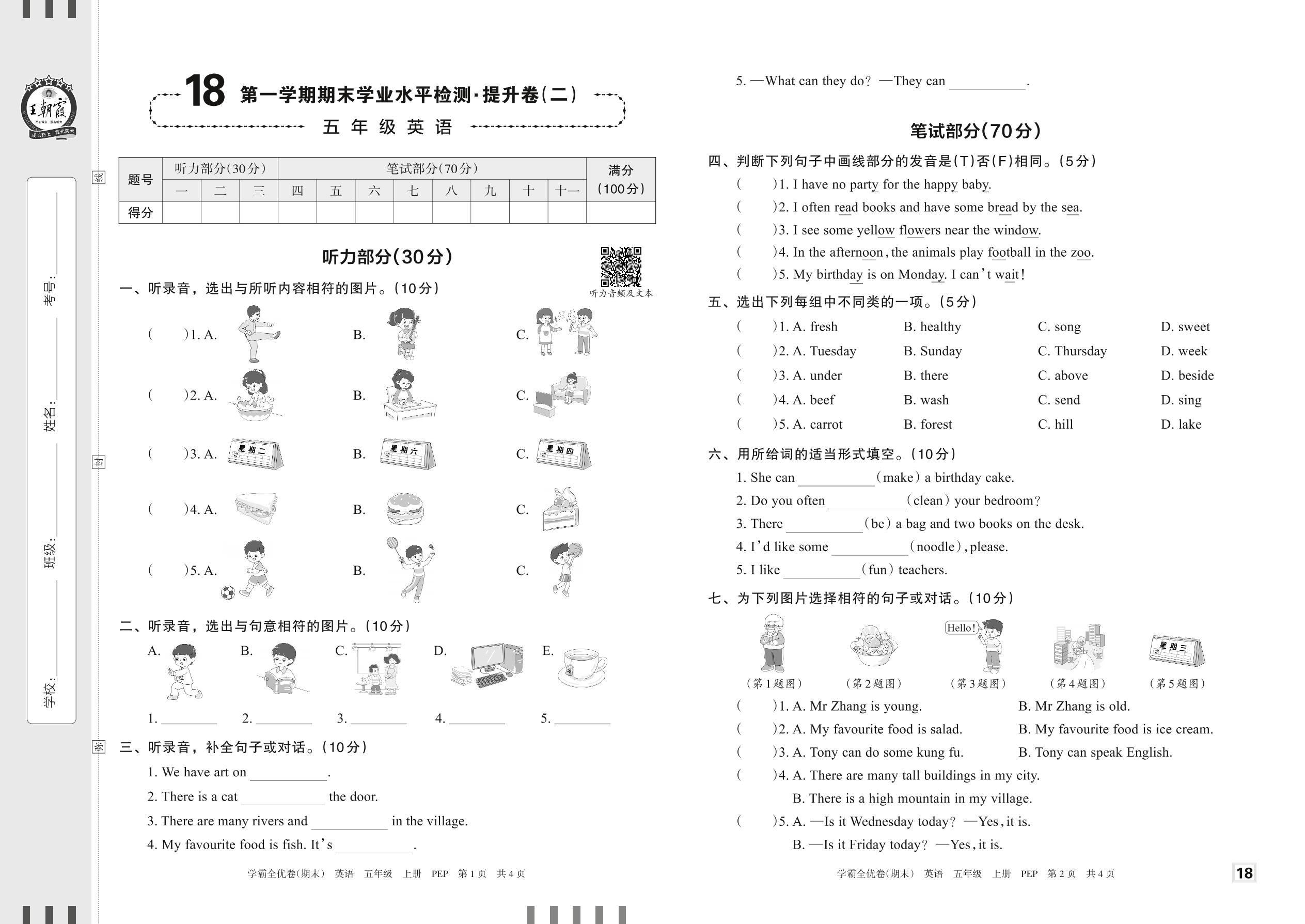 2022上册五年级英语人教PEP版 18 第一学期期末学业水平检测·提升卷(二)