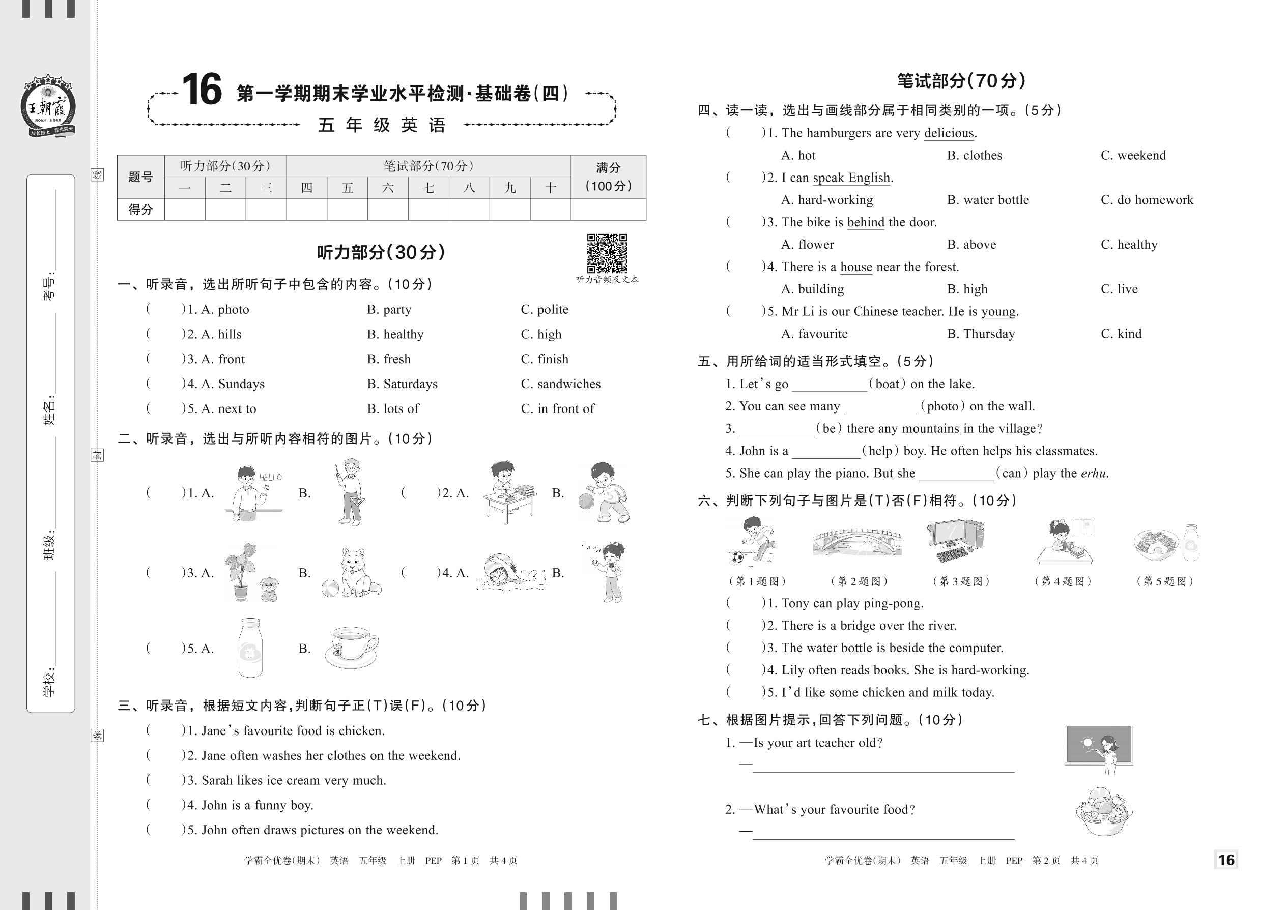 2022上册五年级英语人教PEP版 16 第一学期期末学业水平检测·基础卷(四)