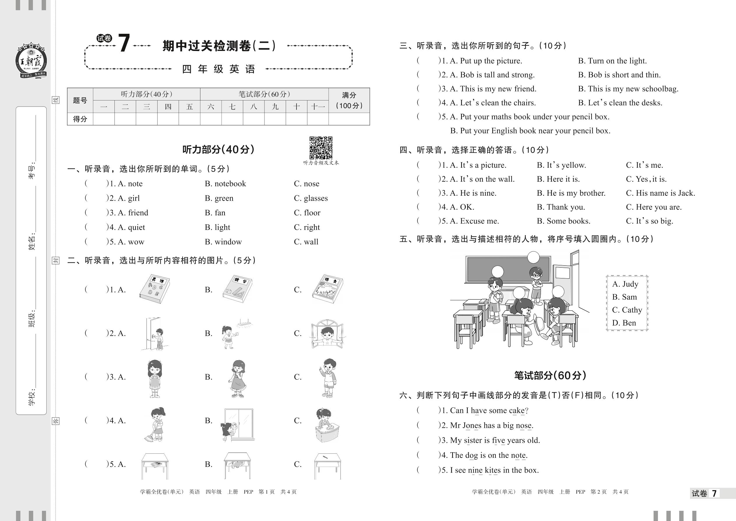 2022上册四年级英语人教PEP版 试卷7 期中过关检测卷(二)