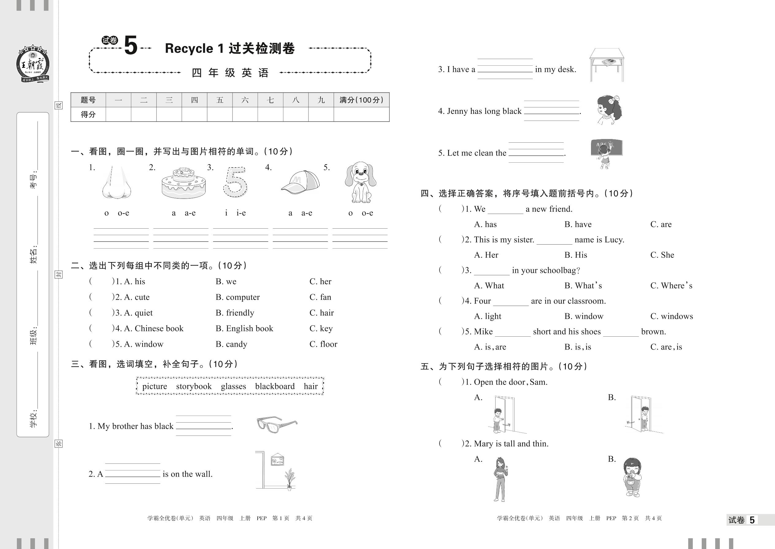 2022上册四年级英语人教PEP版 试卷5 Recycle 1 过关检测卷