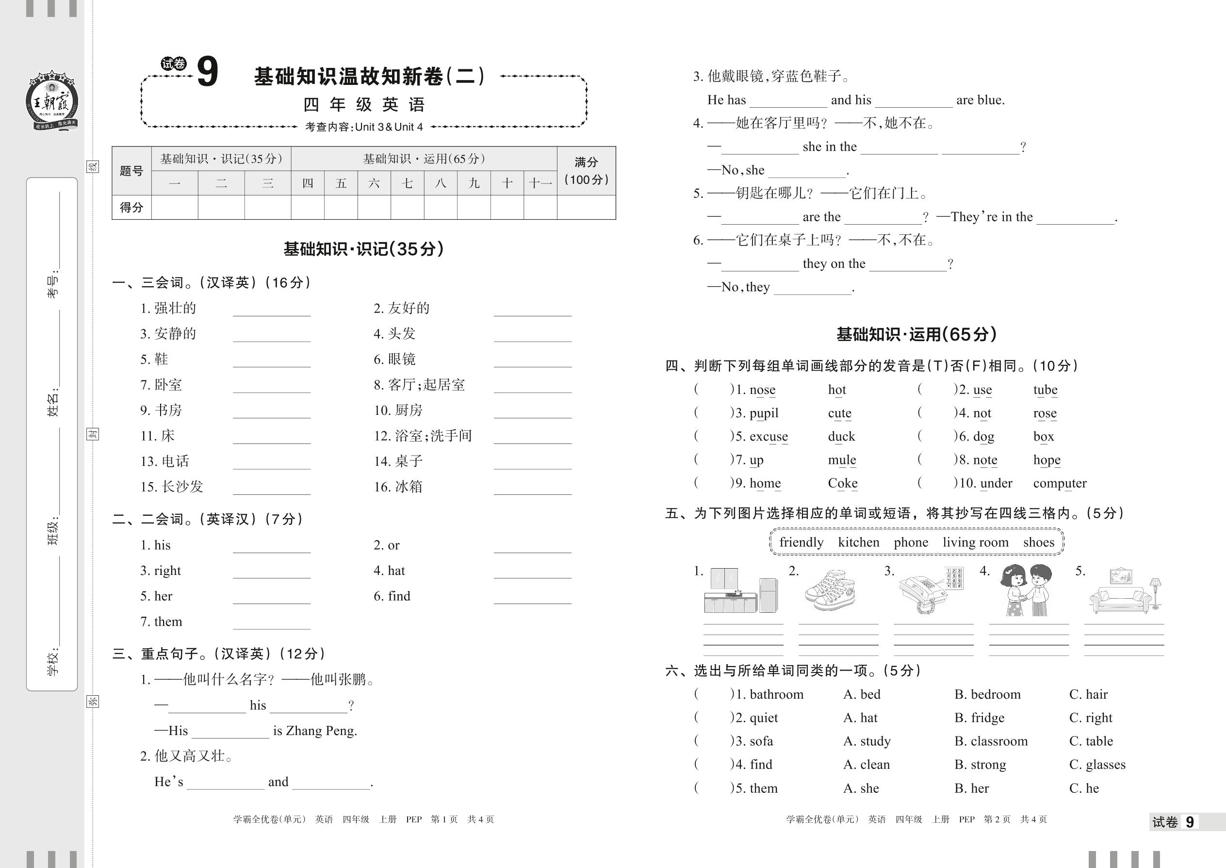 2022上册四年级英语人教PEP版 试卷9 基础知识温故知新卷(二)