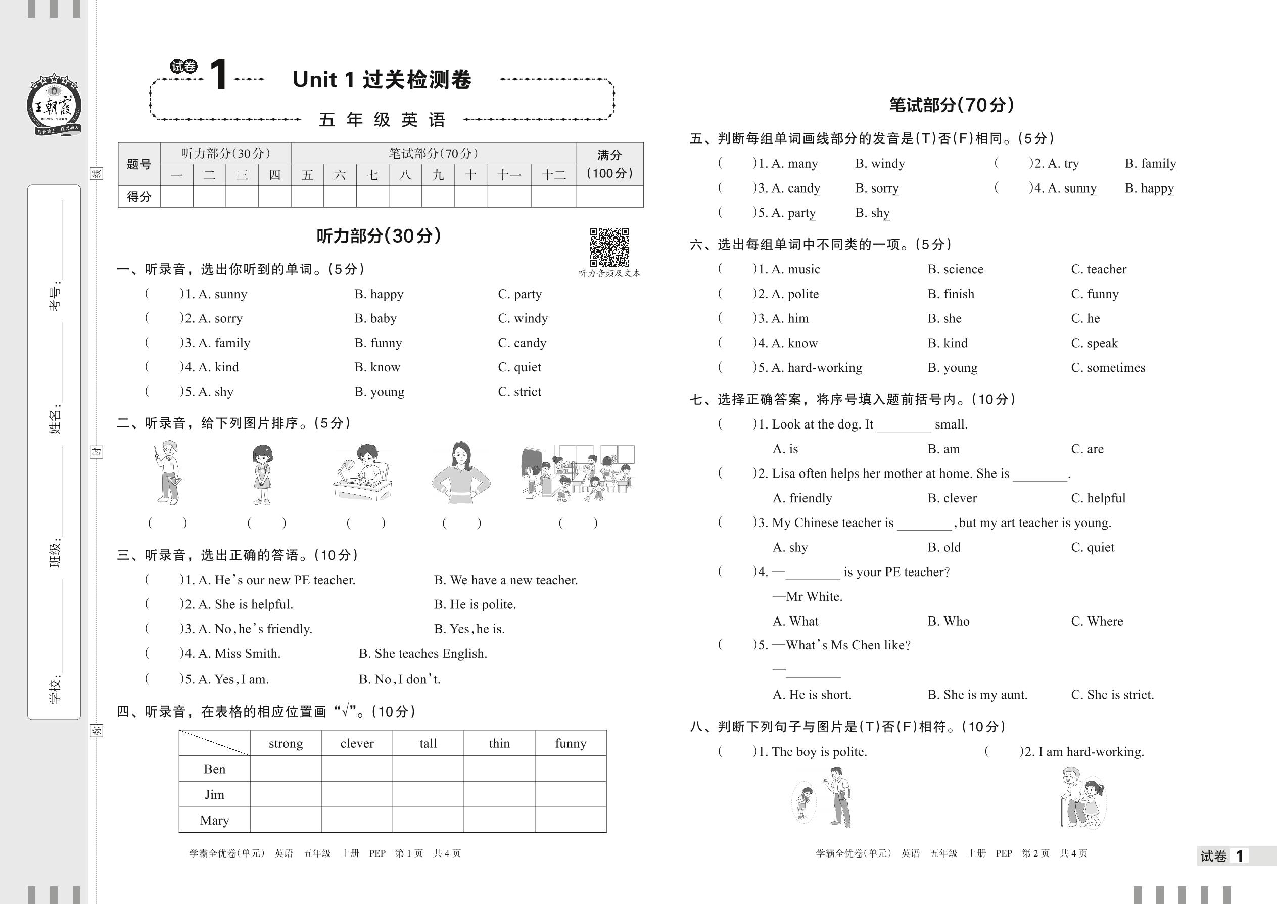 2022上册五年级英语人教PEP版 试卷1 Unit 1 过关检测卷