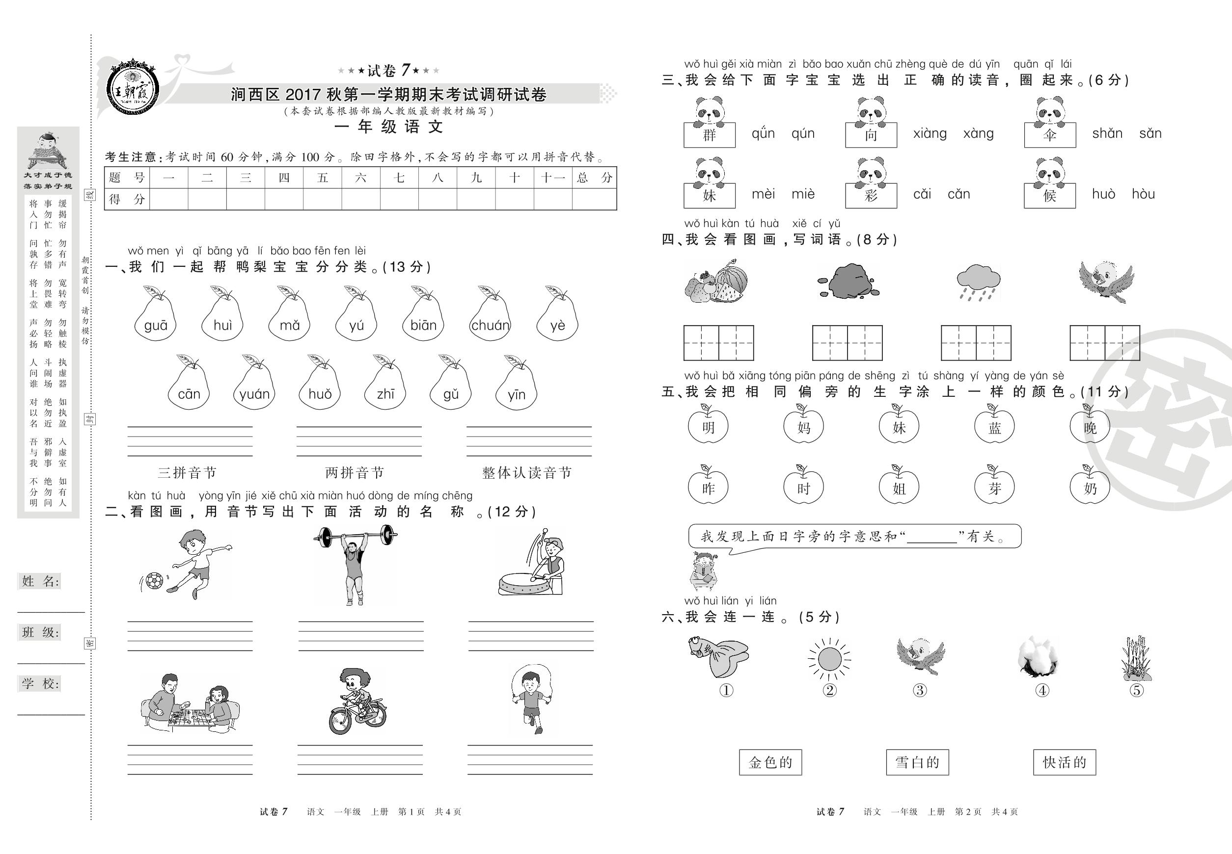 一年级语文人教版上册期末卷