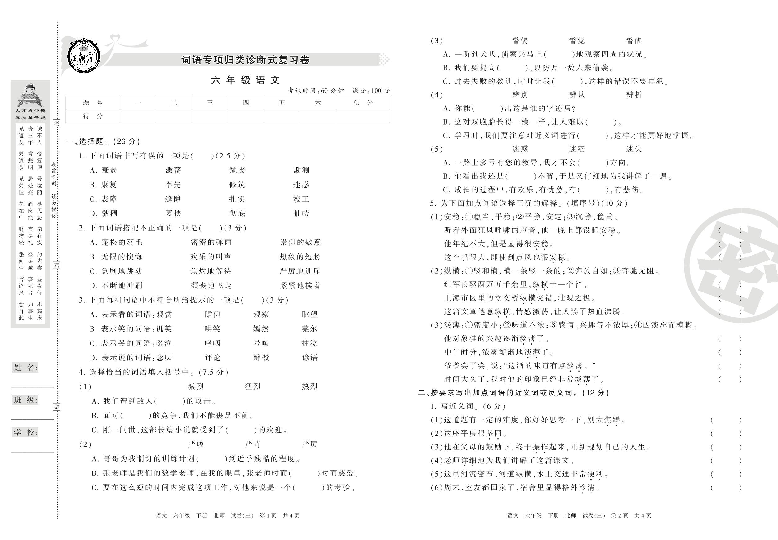 王朝霞期末专项卷六年级下册语文(北师版)_R21080291431【3】