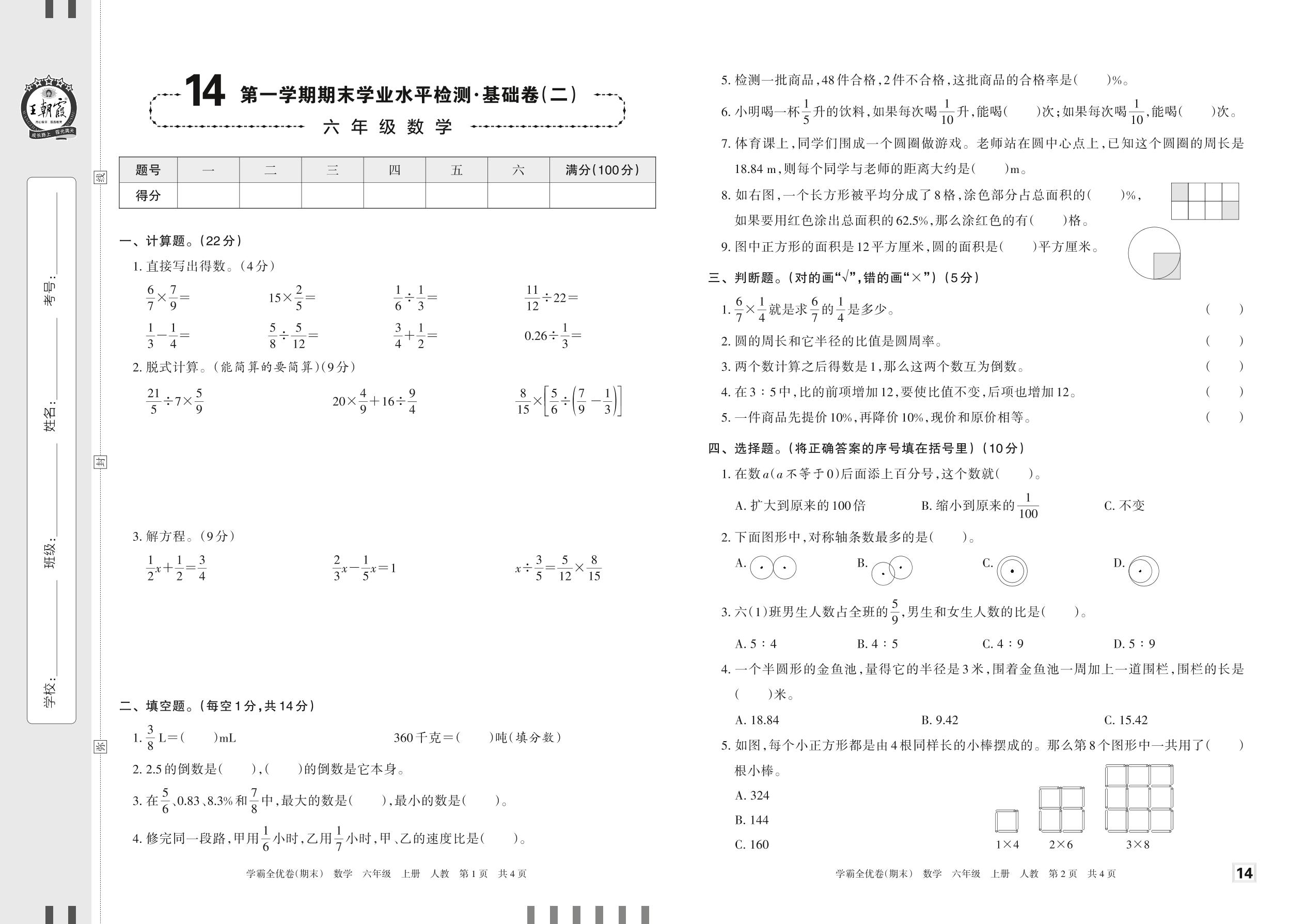 2022上册六年级数学人教版 14 第一学期期末学业水平检测·基础卷(二)