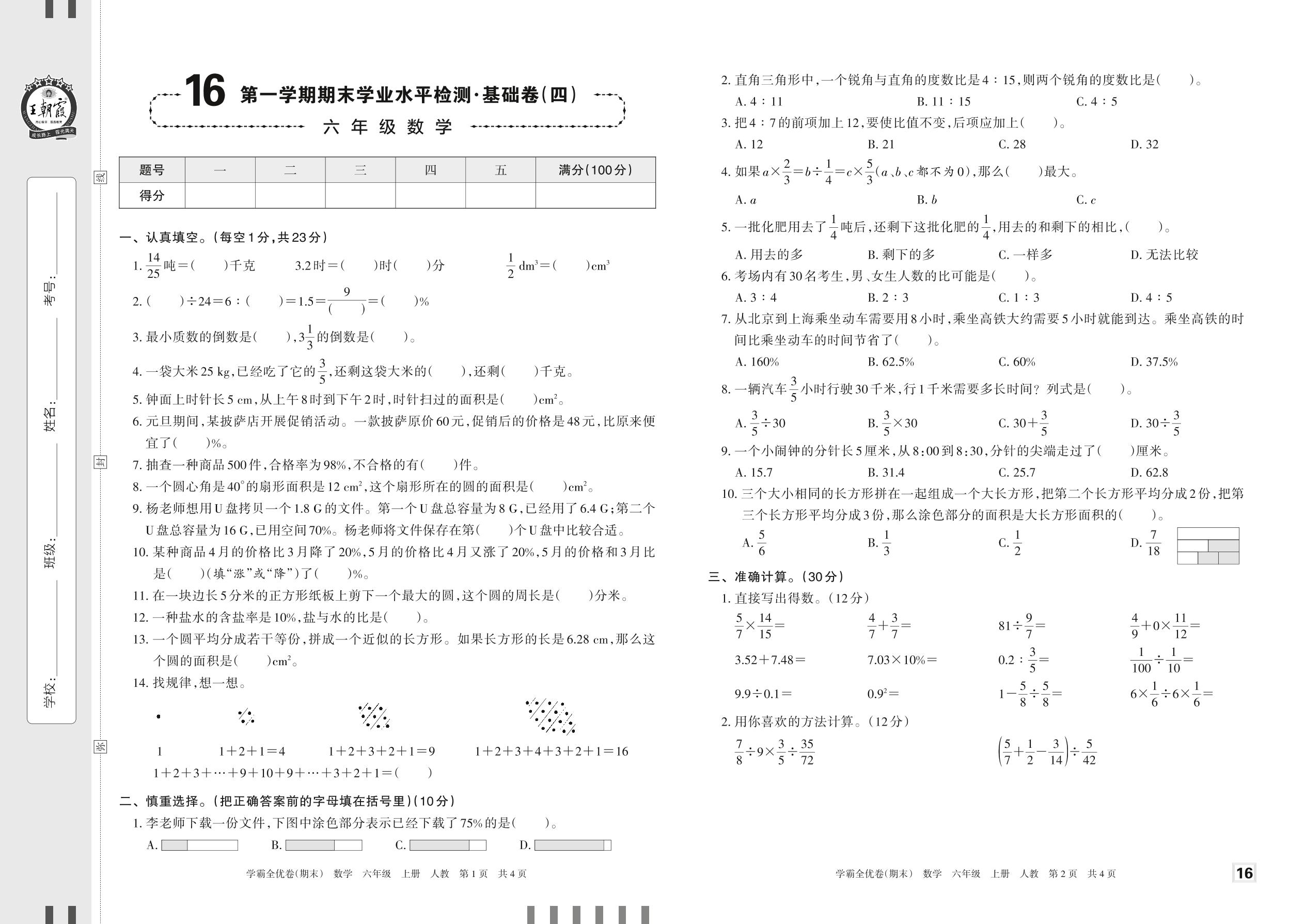 2022上册六年级数学人教版 16 第一学期期末学业水平检测·基础卷(四)