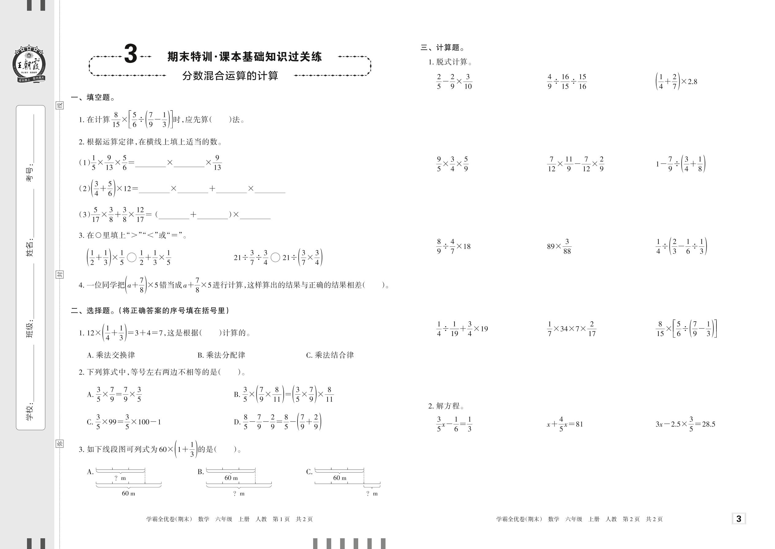 2022上册六年级数学人教版 3 期末特训·课本基础知识过关练——分数混合运算的计算