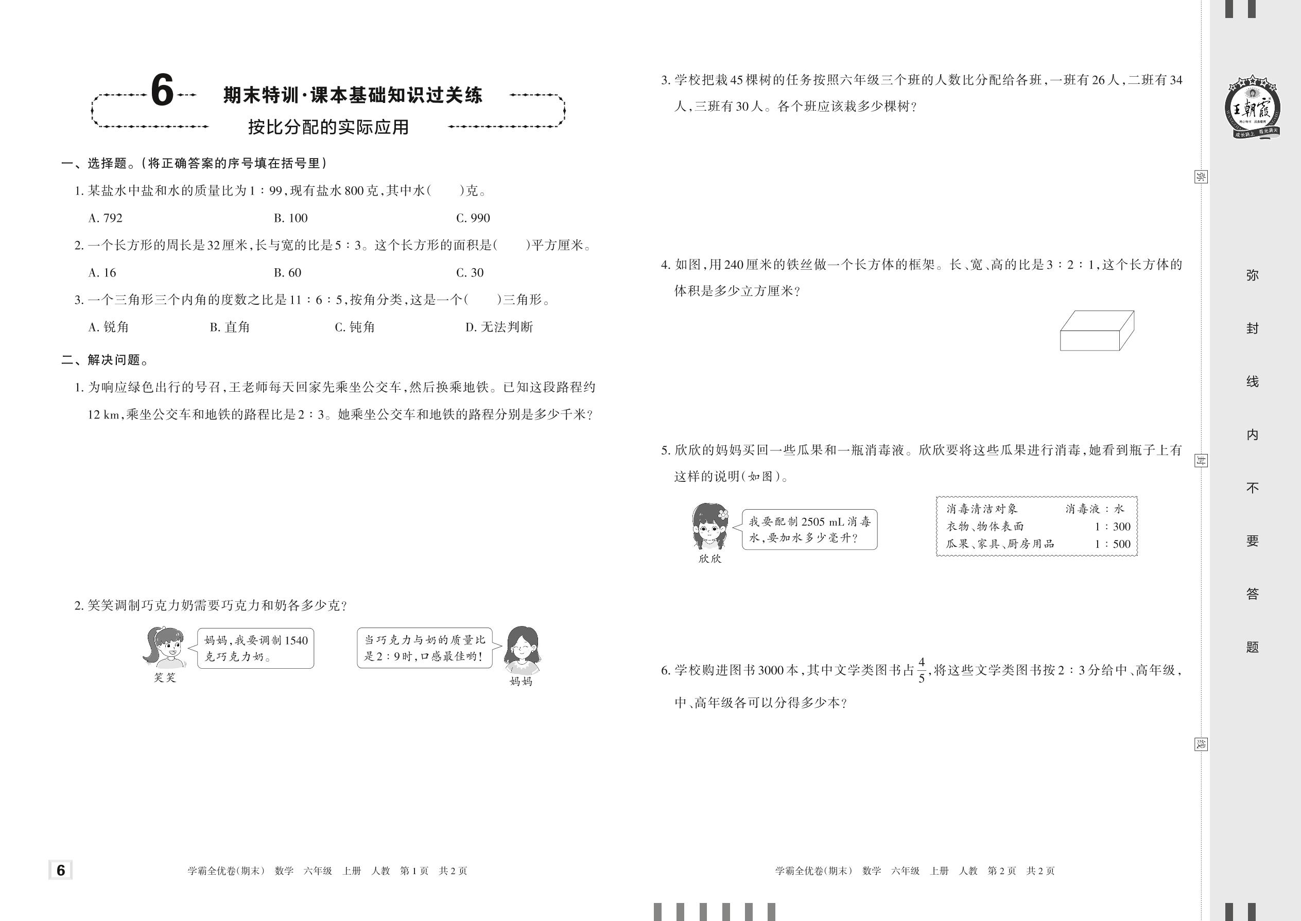 2022上册六年级数学人教版 6 期末特训·课本基础知识过关练——按比分配的实际应用