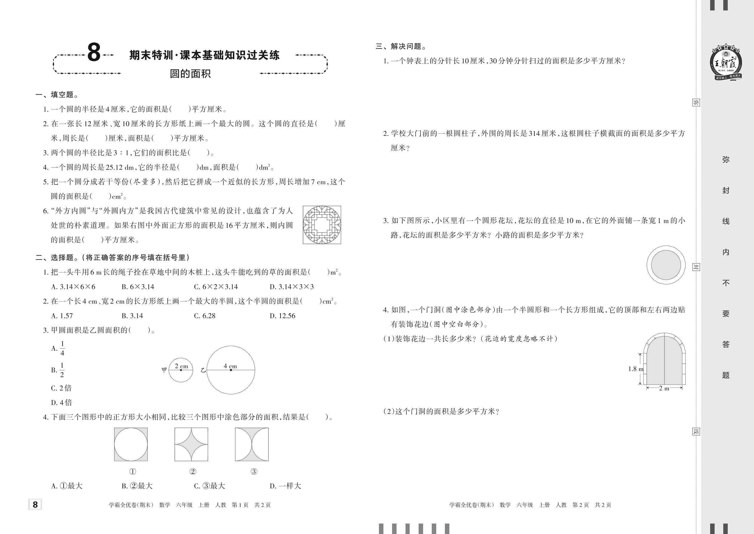 2022上册六年级数学人教版 8 期末特训·课本基础知识过关练——圆的面积