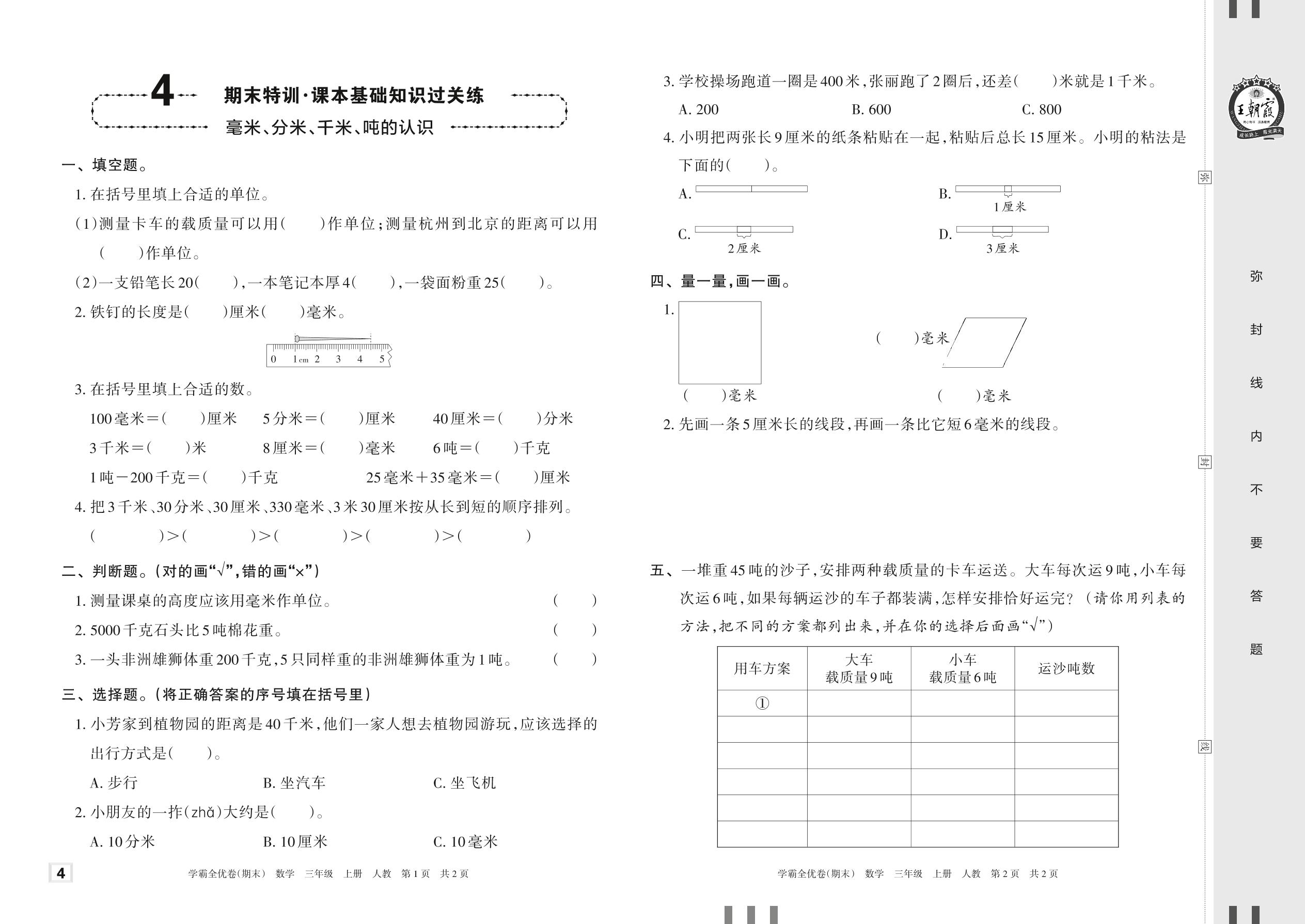 2022上册三年级数学人教版 4 期末特训·课本基础知识过关练——毫米、分米、千米、吨的认识