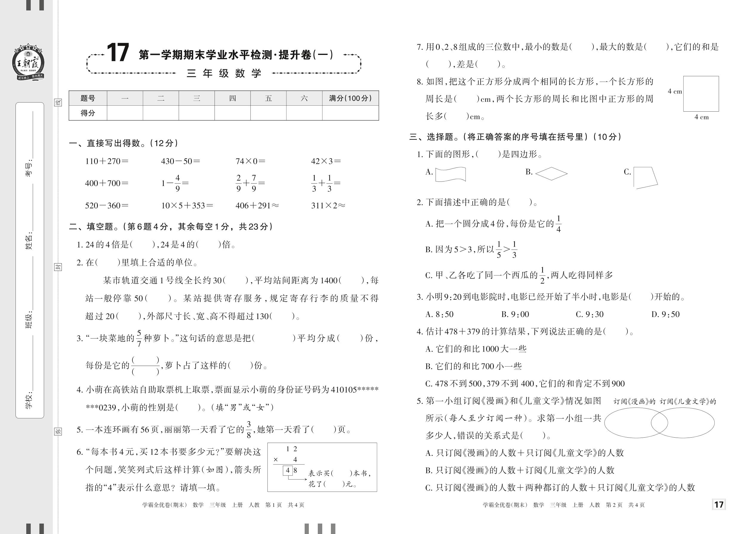 2022上册三年级数学人教版 17 第一学期期末学业水平检测·提升卷(一)