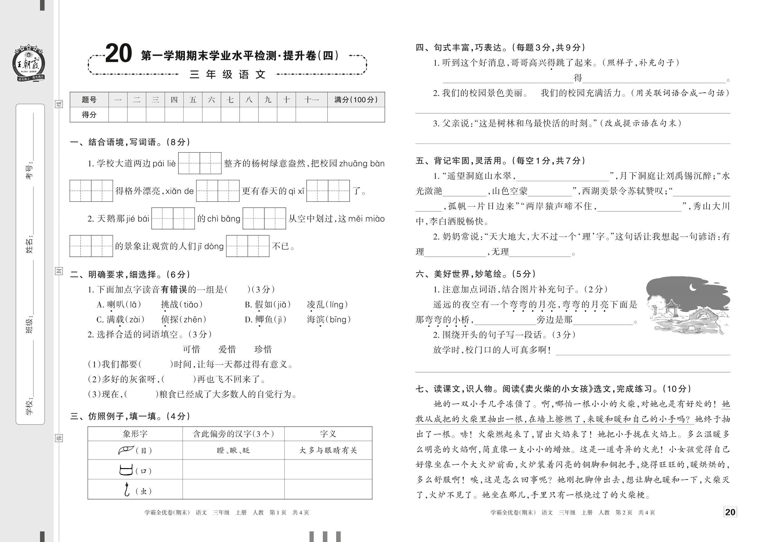 2022上册三年级语文人教版 20 第一学期期末学业水平检测·提升卷(四)