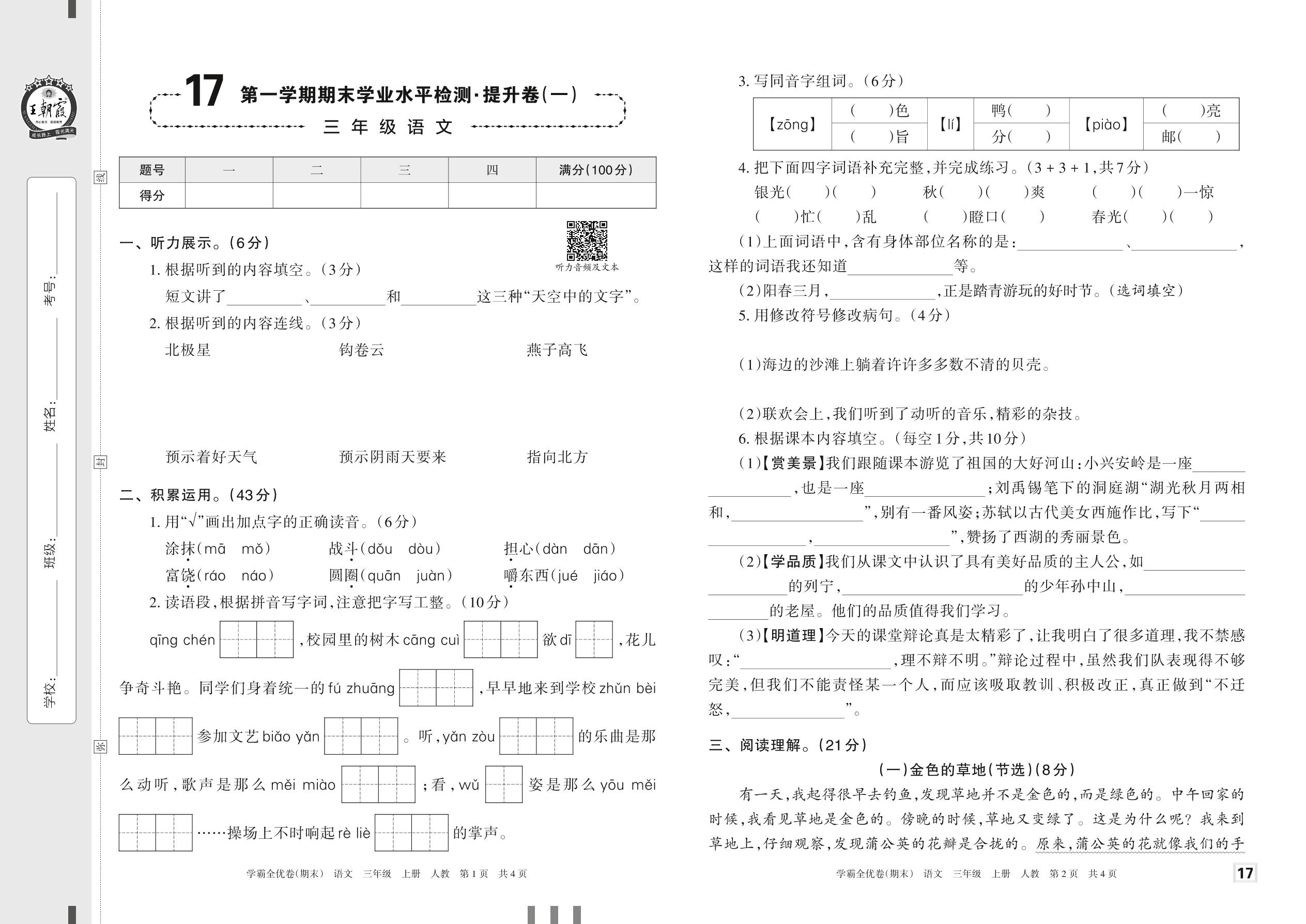 2022上册三年级语文人教版 17 第一学期期末学业水平检测·提升卷(一)