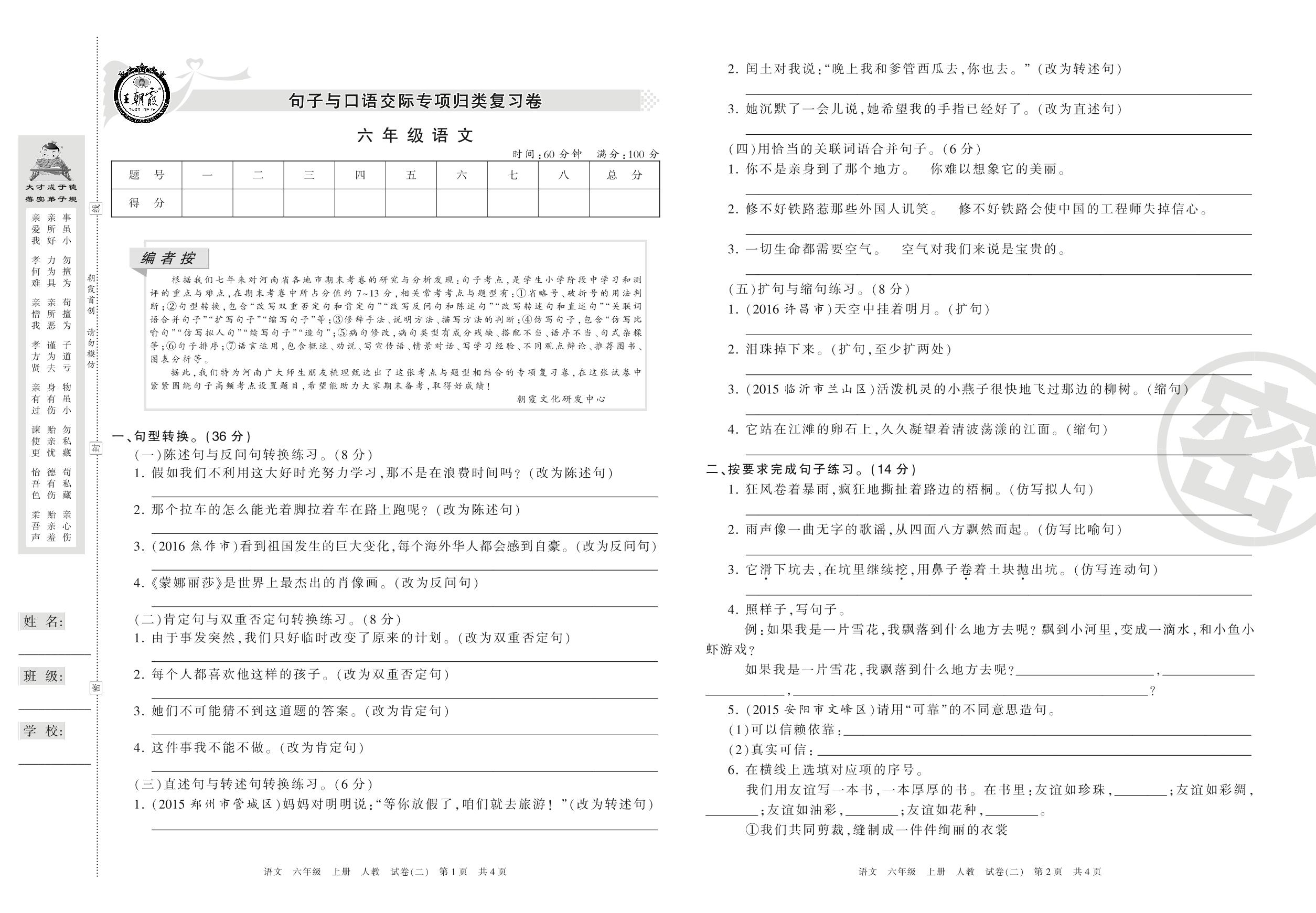 王朝霞期末专项卷六年级上册语文(人教版)_R21080292705【2】