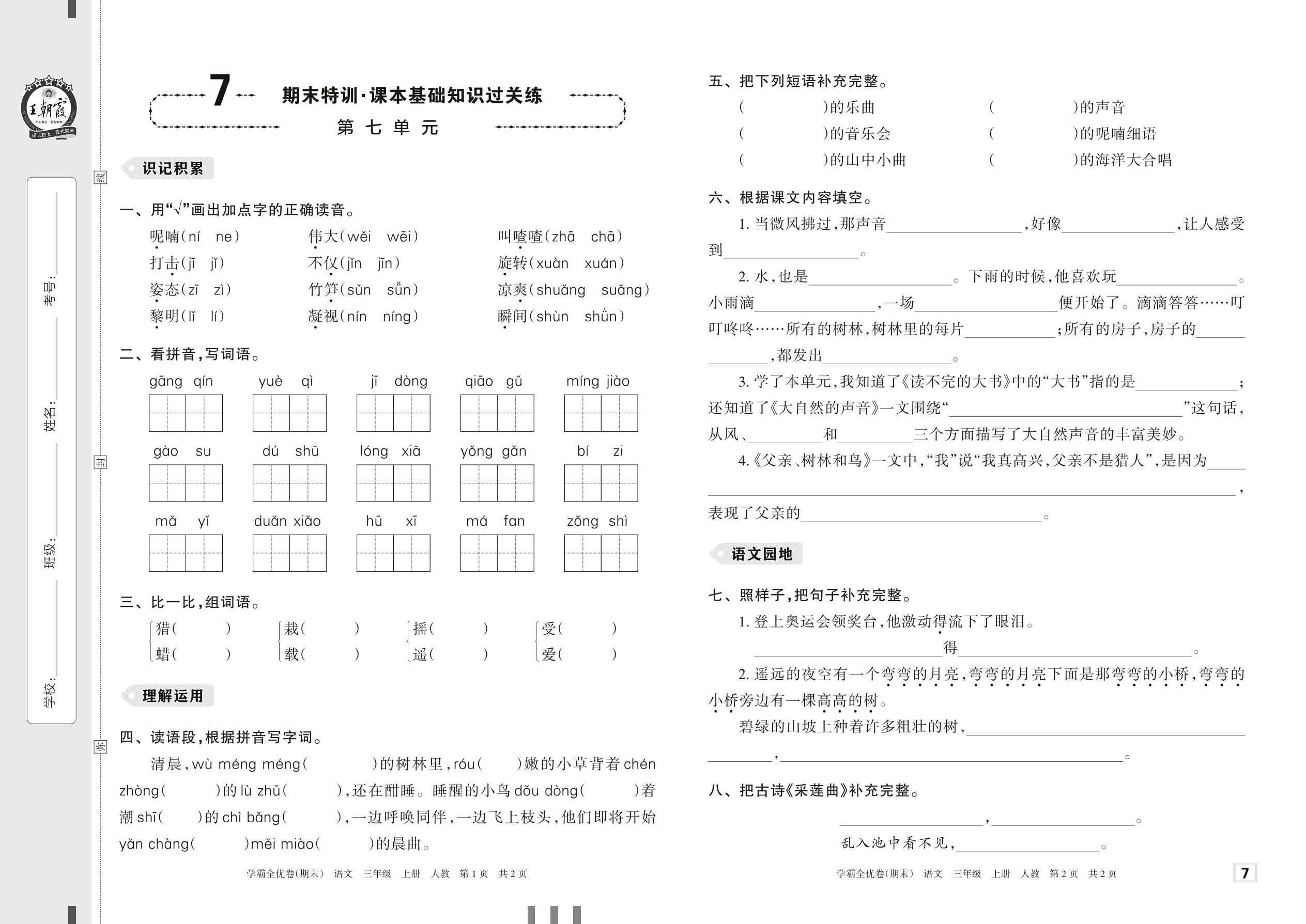 2022上册三年级语文人教版 7 期末特训·课本基础知识过关练——第七单元
