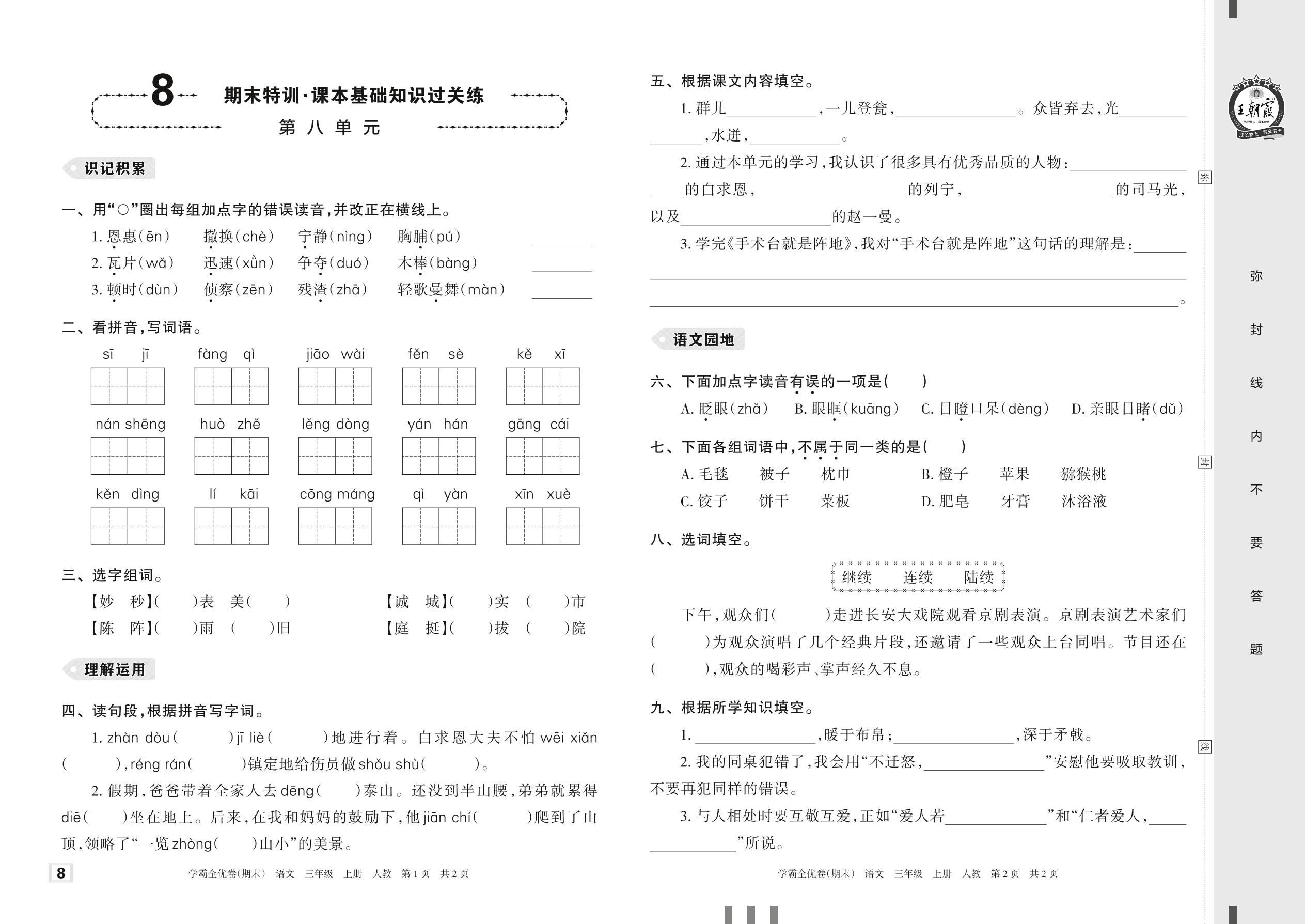 2022上册三年级语文人教版 8 期末特训·课本基础知识过关练——第八单元