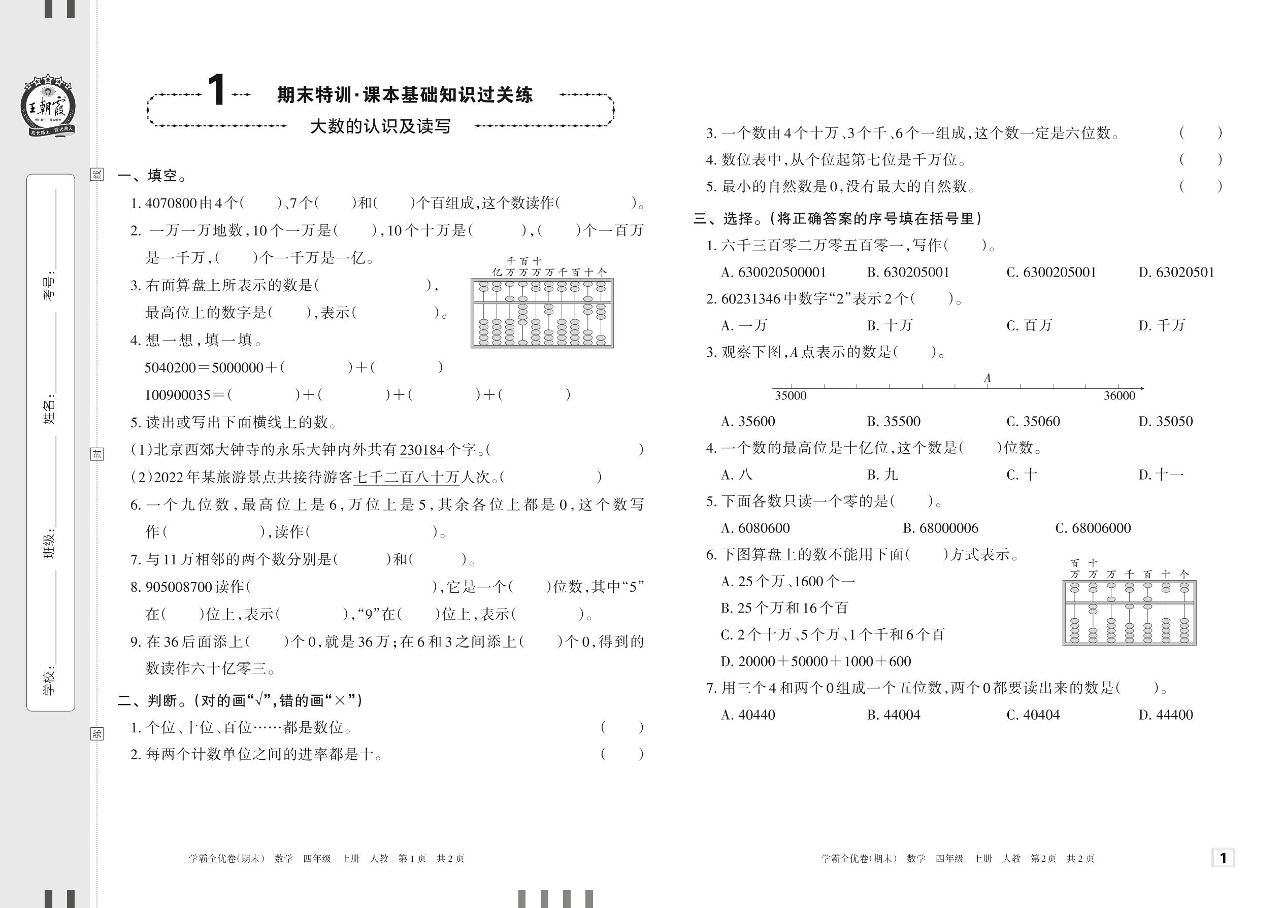 2022上册四年级数学人教版 1 期末特训·课本基础知识过关练——大数的认识及读写