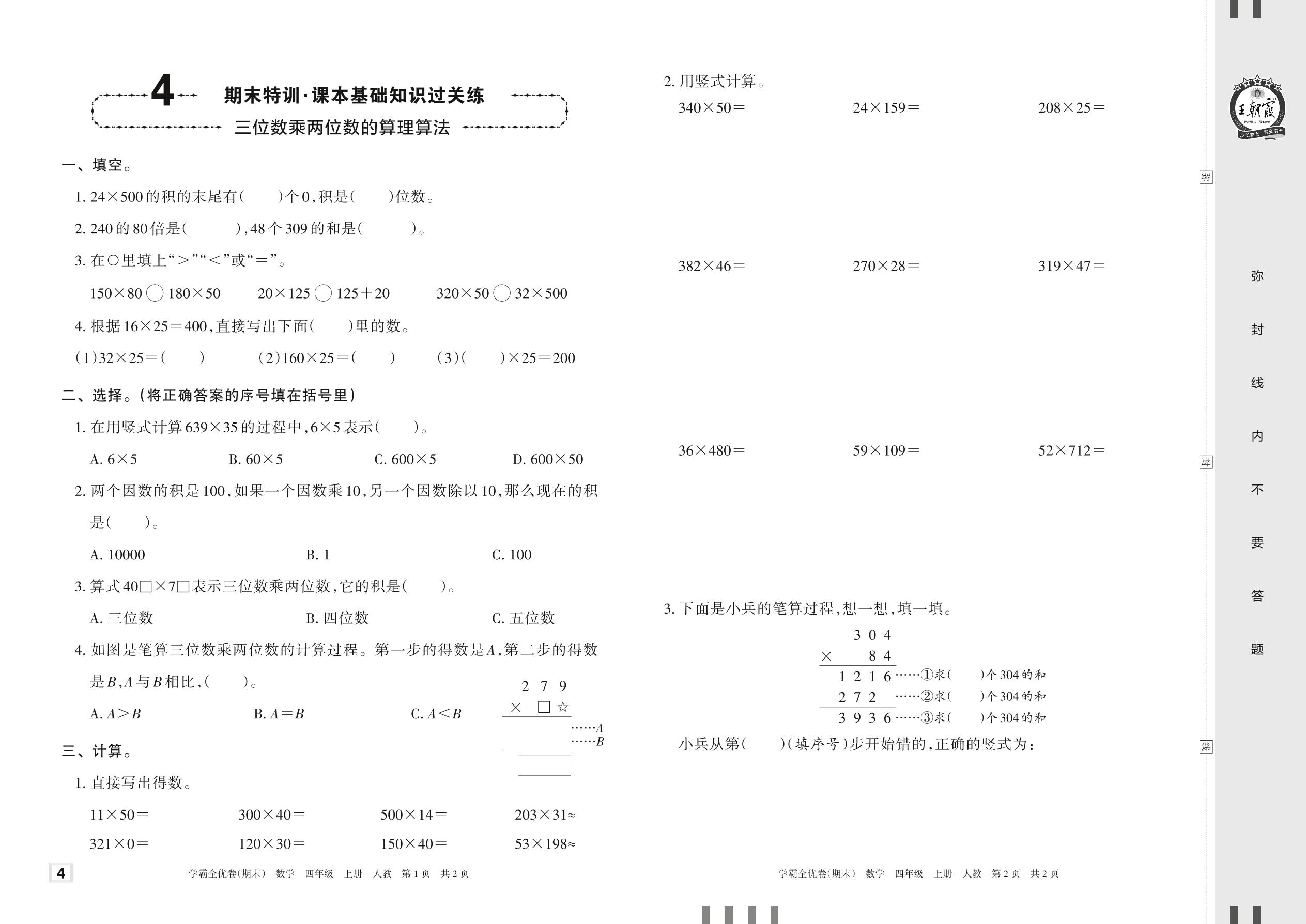 2022上册四年级数学人教版 4 期末特训·课本基础知识过关练——三位数乘两位数的算理算法