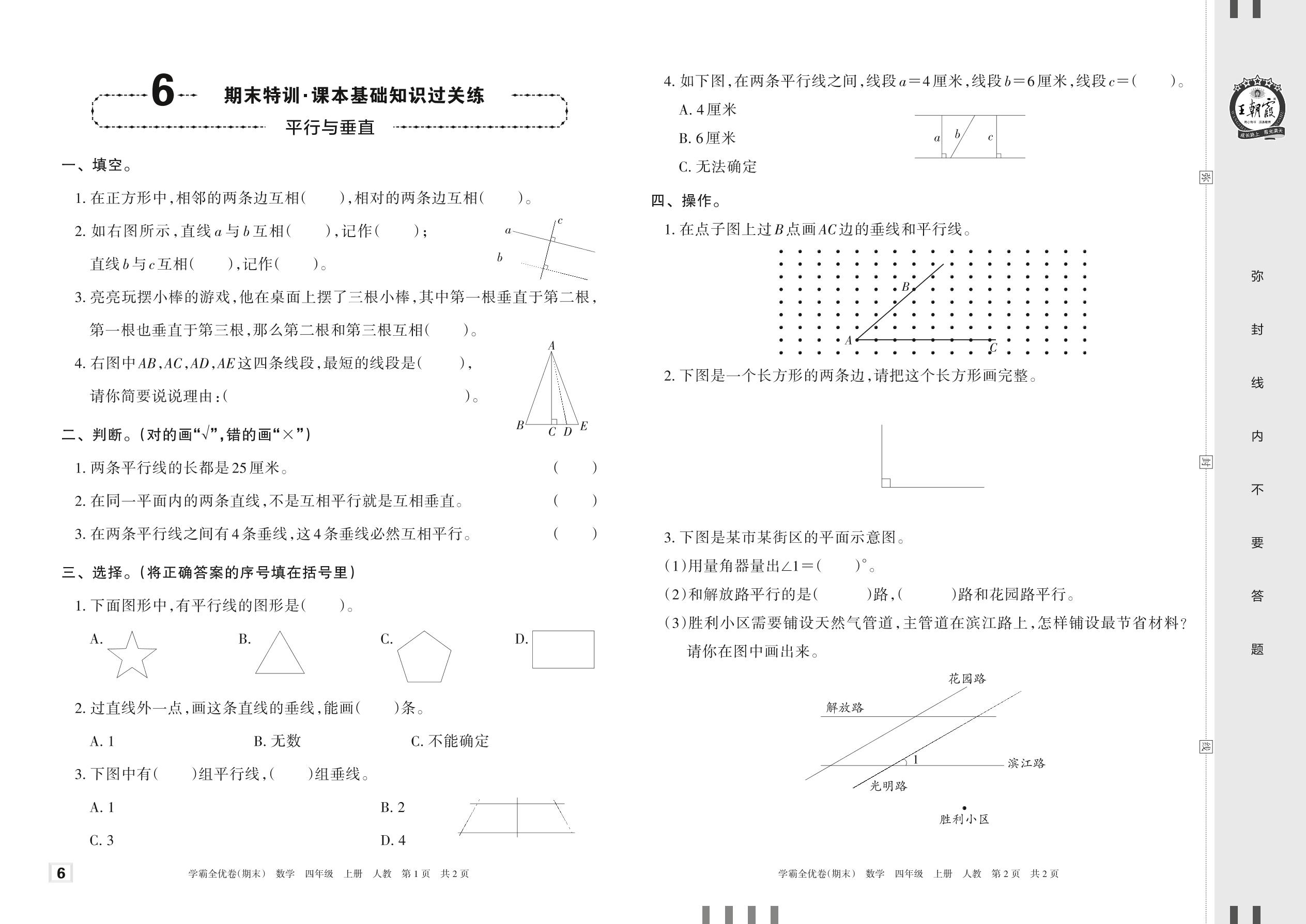 2022上册四年级数学人教版 6 期末特训·课本基础知识过关练——平行与垂直