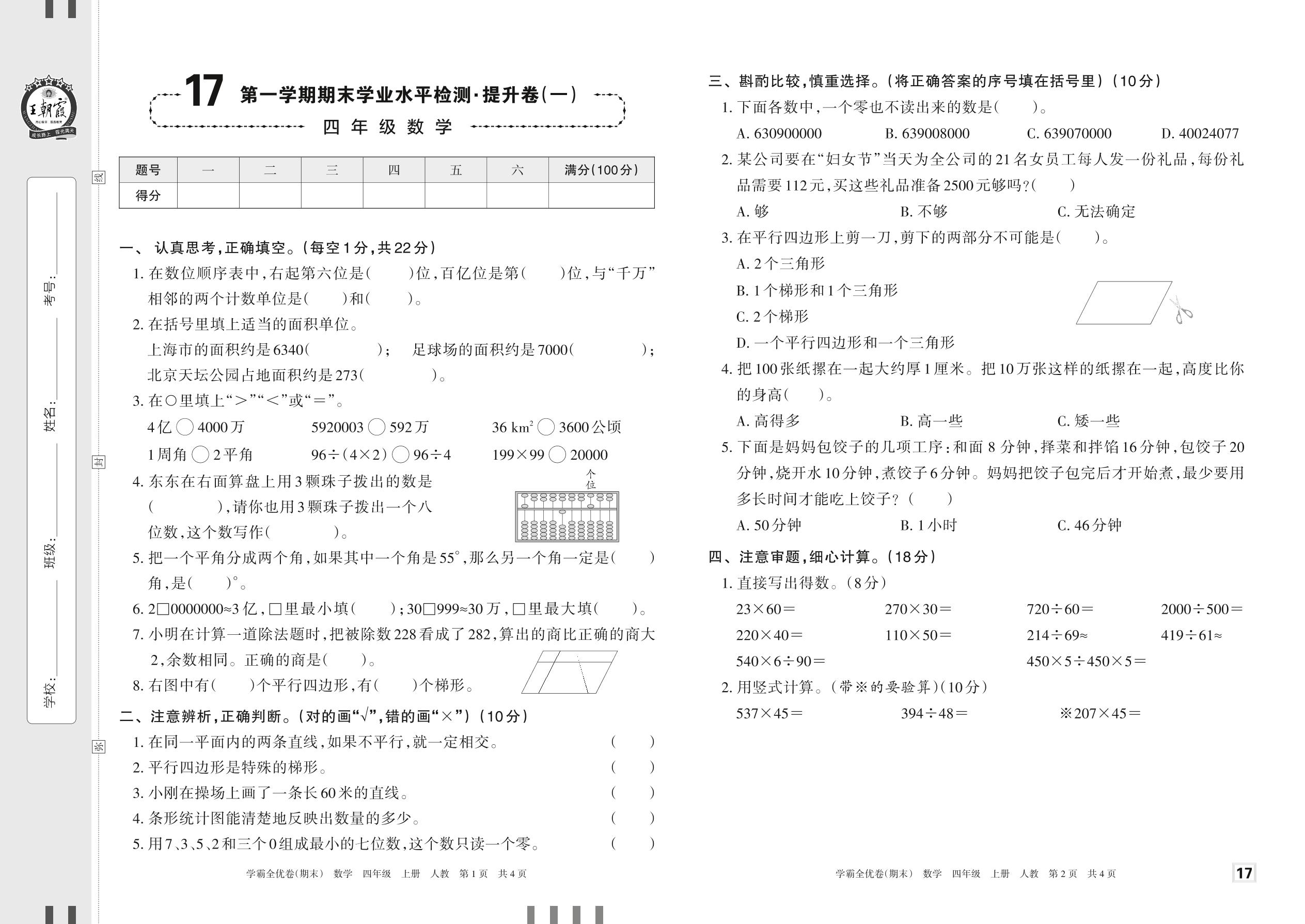 2022上册四年级数学人教版 17 第一学期期末学业水平检测·提升卷(一)