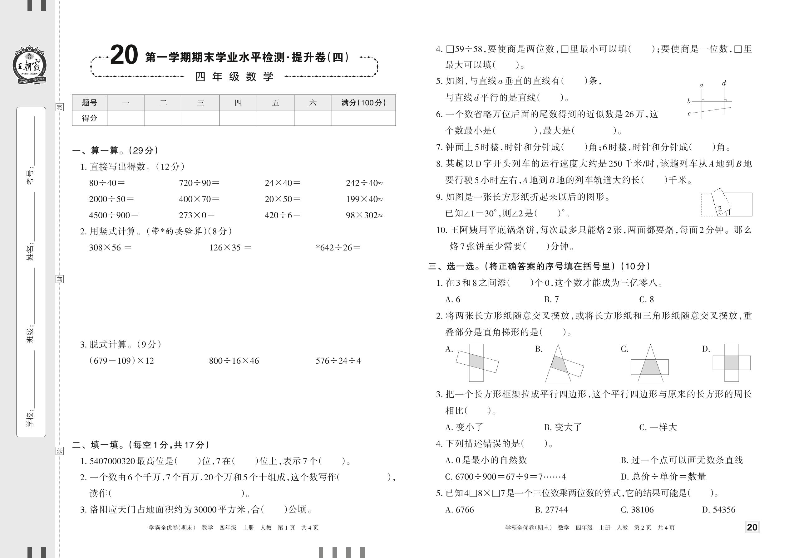 2022上册四年级数学人教版 20 第一学期期末学业水平检测·提升卷(四)