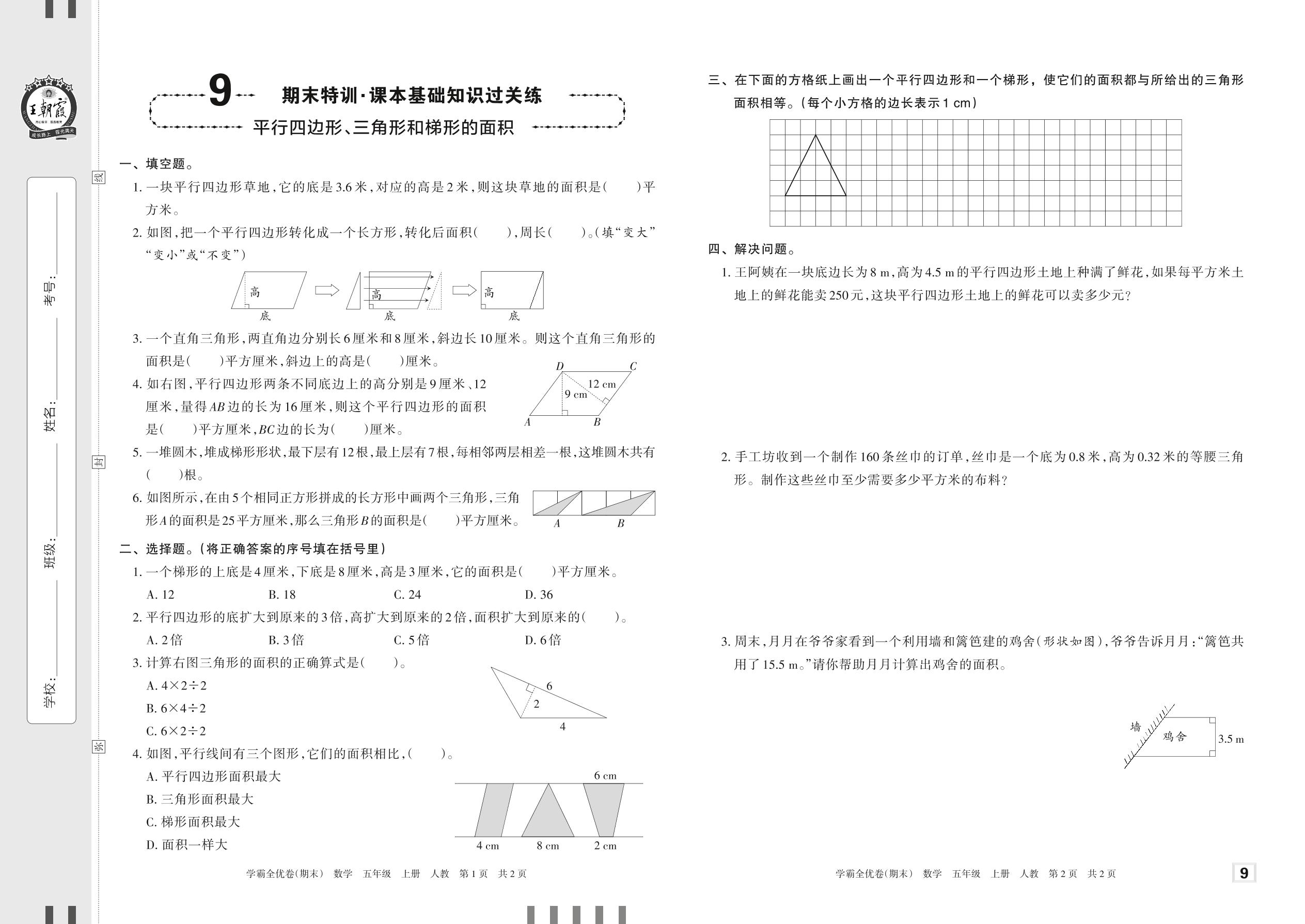 2022上册五年级数学人教版 9 期末特训·课本基础知识过关练——平行四边形、三角形和梯形的面积