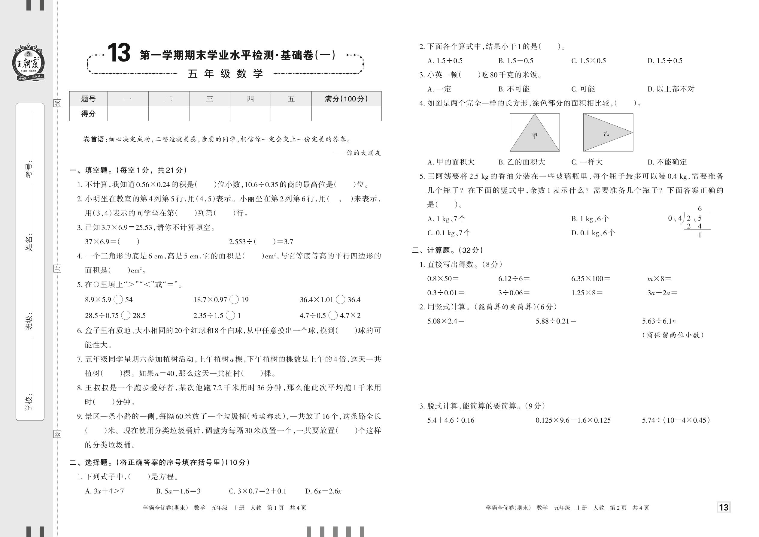 2022上册五年级数学人教版 13 第一学期期末学业水平检测·基础卷(一)