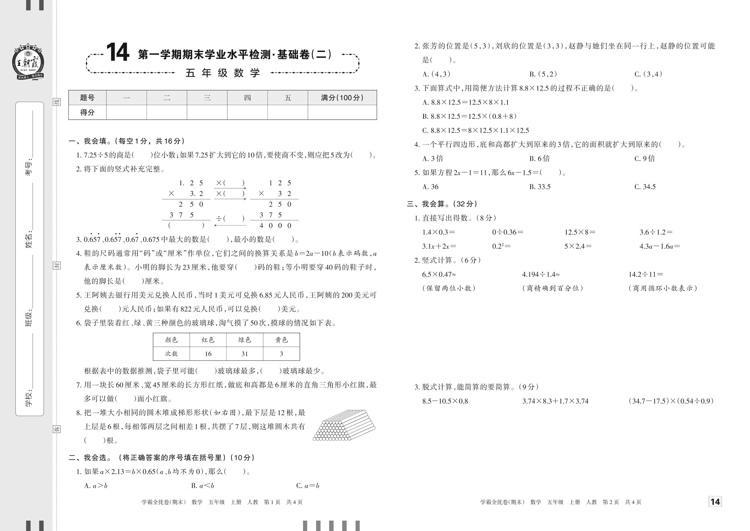 2022上册五年级数学人教版 14 第一学期期末学业水平检测·基础卷(二)