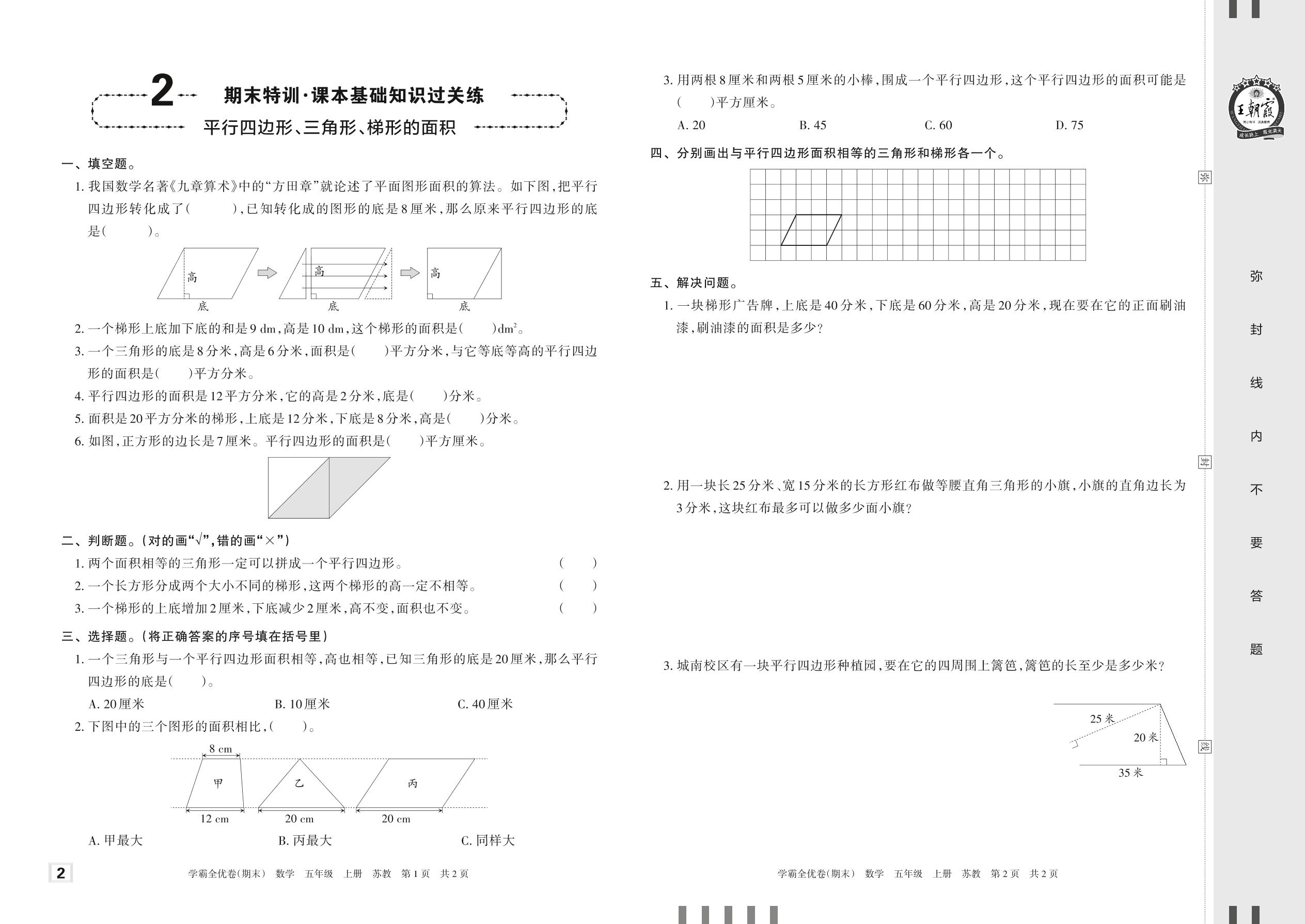 2022上册五年级数学苏教版 2 期末特训·课本基础知识过关练——平行四边形、三角形、梯形的面积