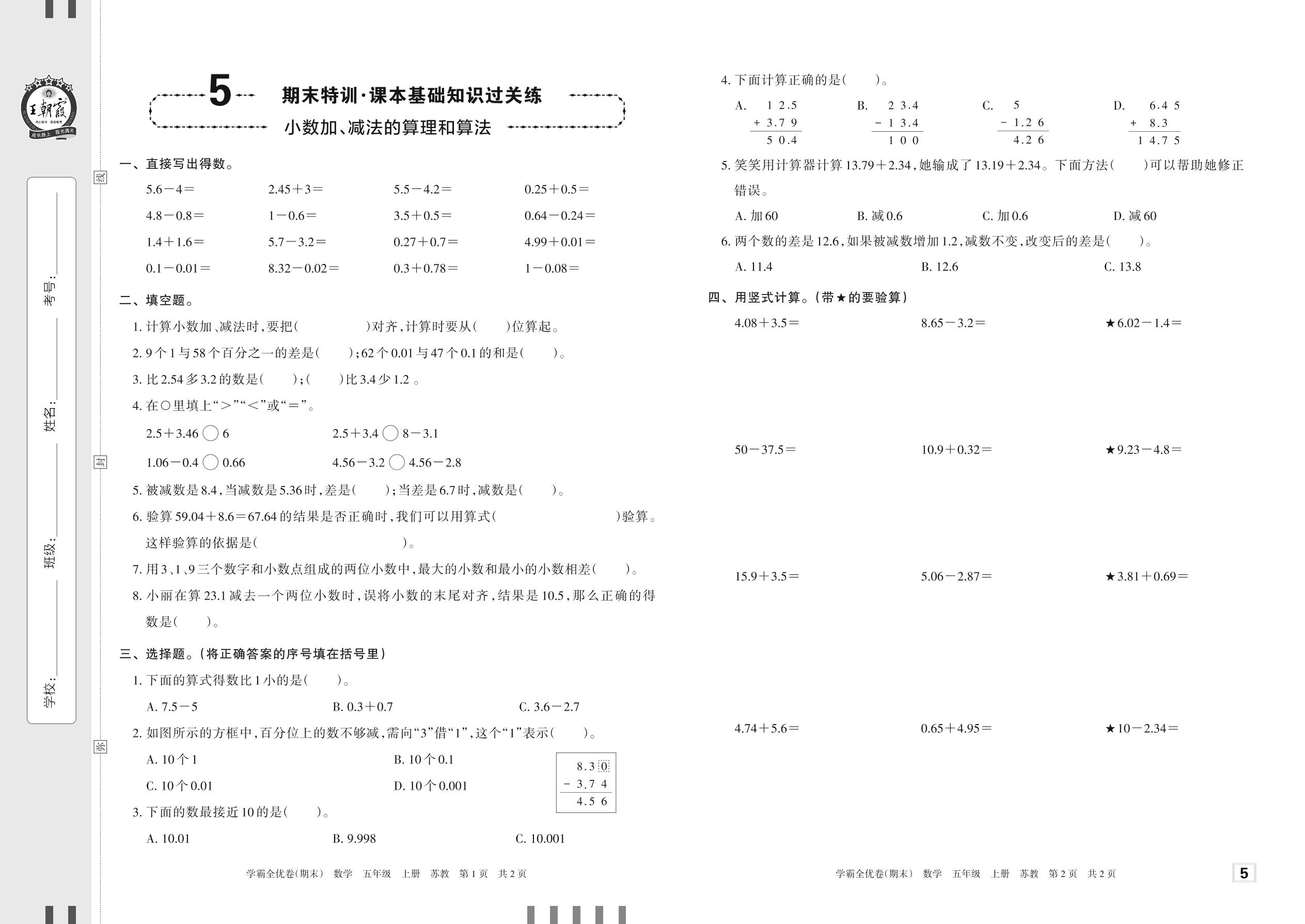 2022上册五年级数学苏教版 5 期末特训·课本基础知识过关练——小数加、减法的算理和算法