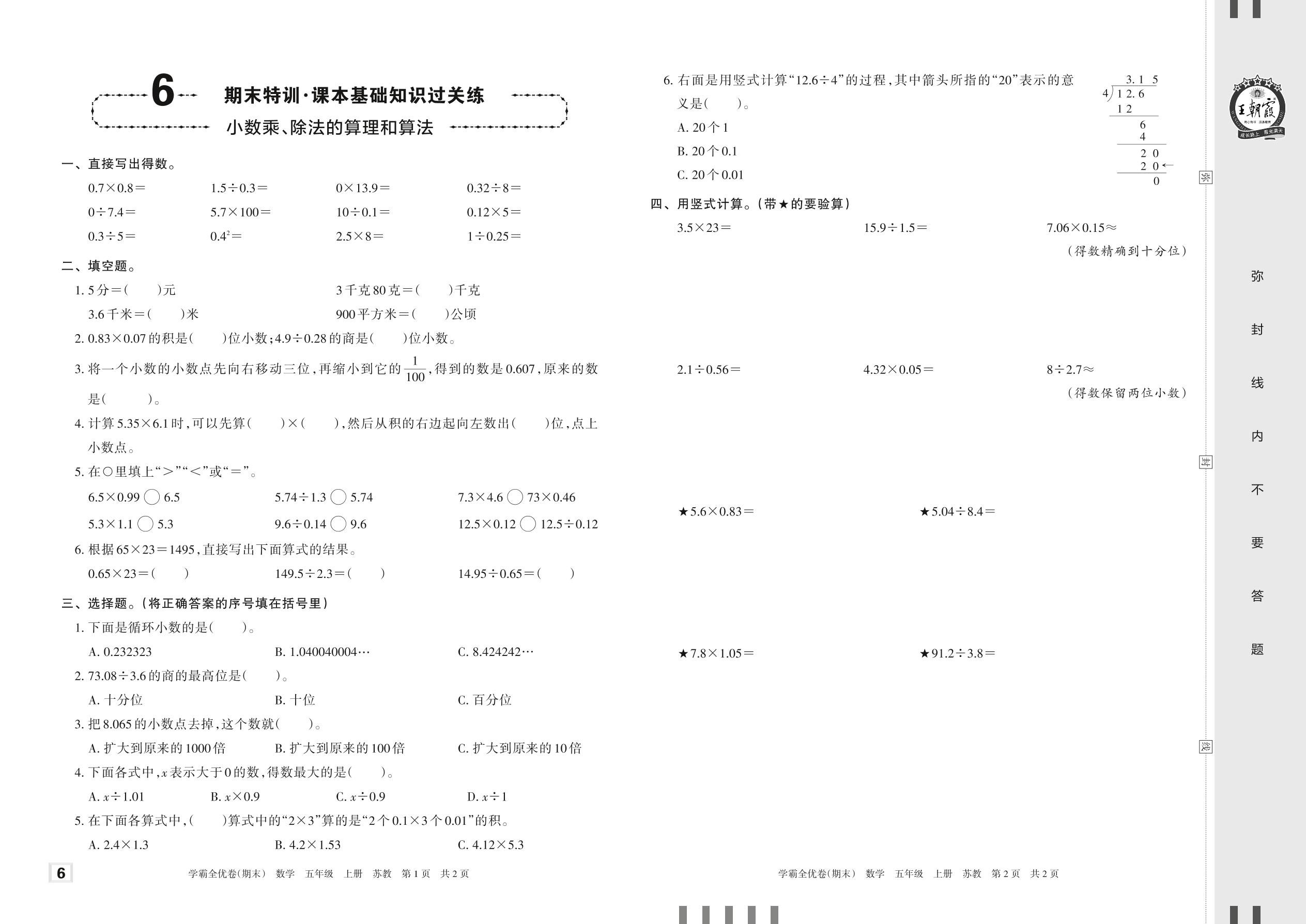 2022上册五年级数学苏教版 6 期末特训·课本基础知识过关练——小数乘、除法的算理和算法