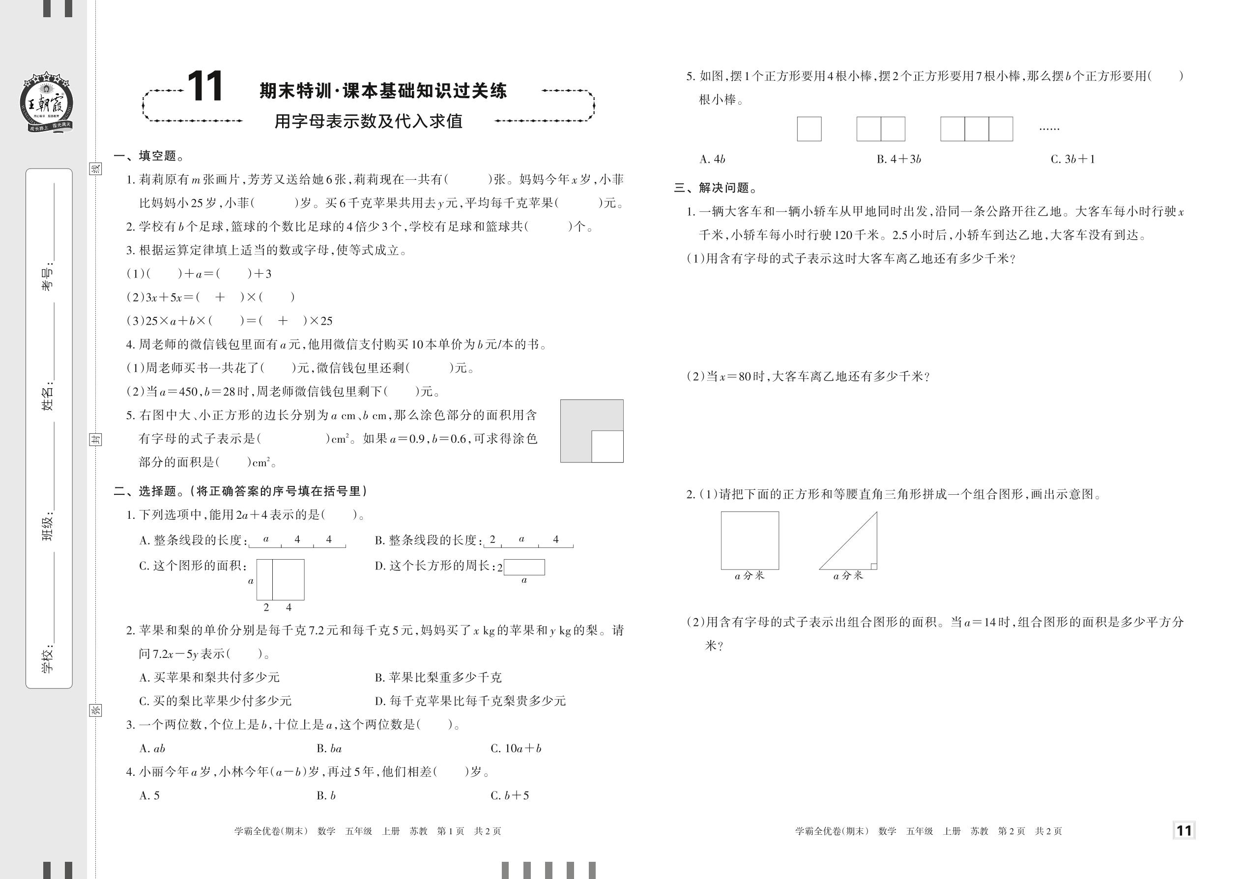 2022上册五年级数学苏教版 11 期末特训·课本基础知识过关练——用字母表示数及代入求值