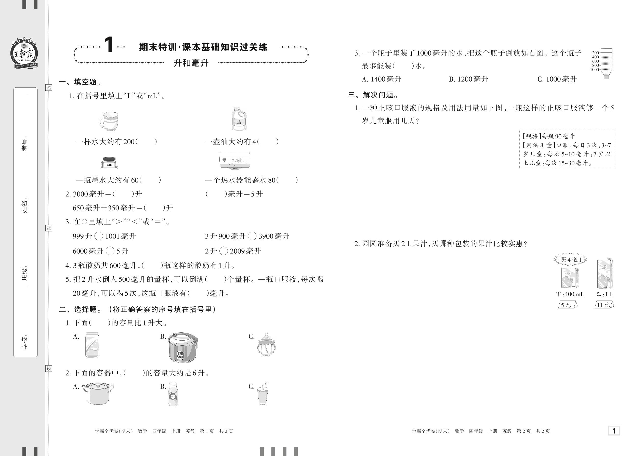 2022上册四年级数学苏教版 1 期末特训·课本基础知识过关练——升和毫升