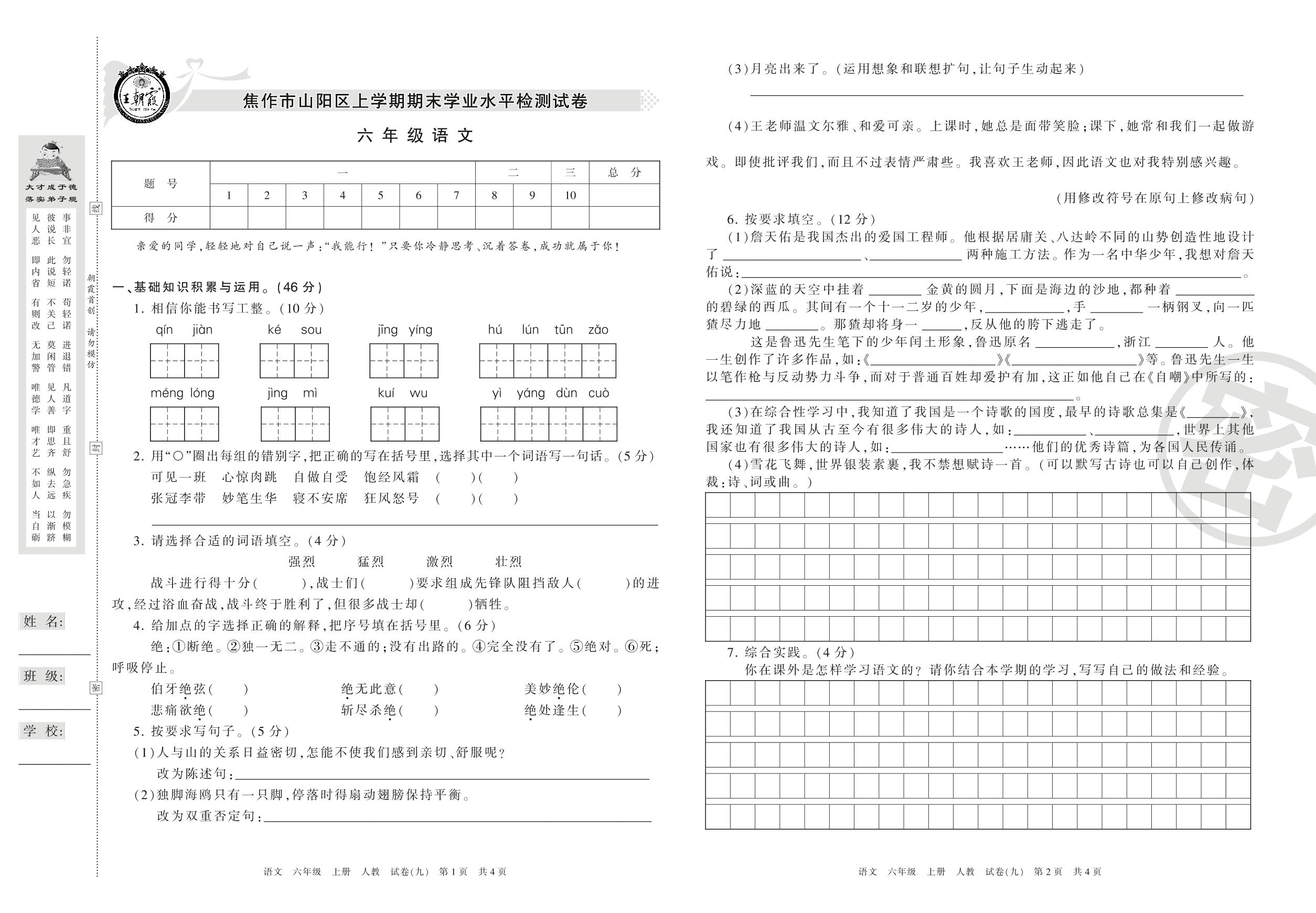 2016-2017学年第一学期焦作市山阳区六年级语文试卷(人教版)【9】